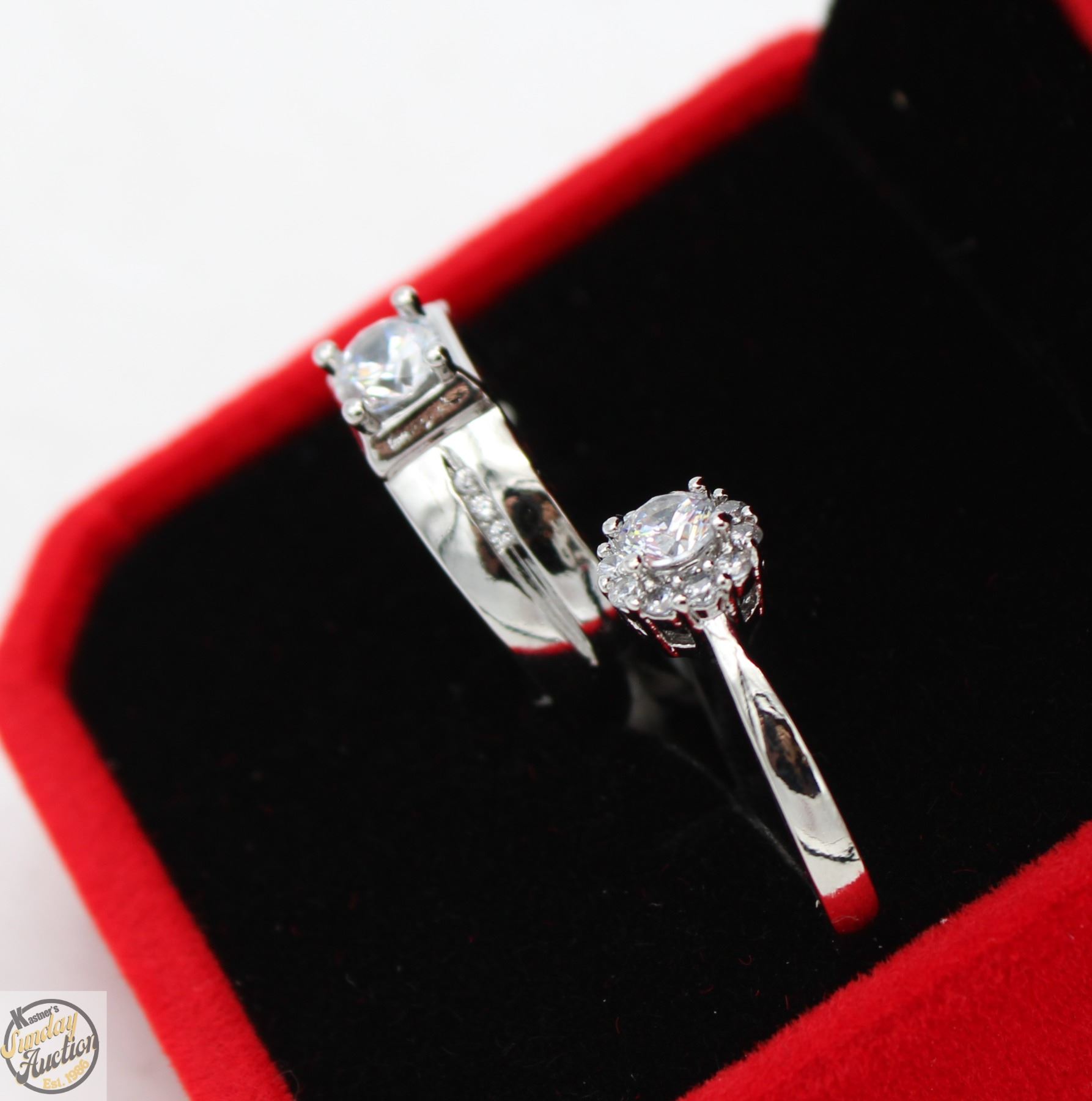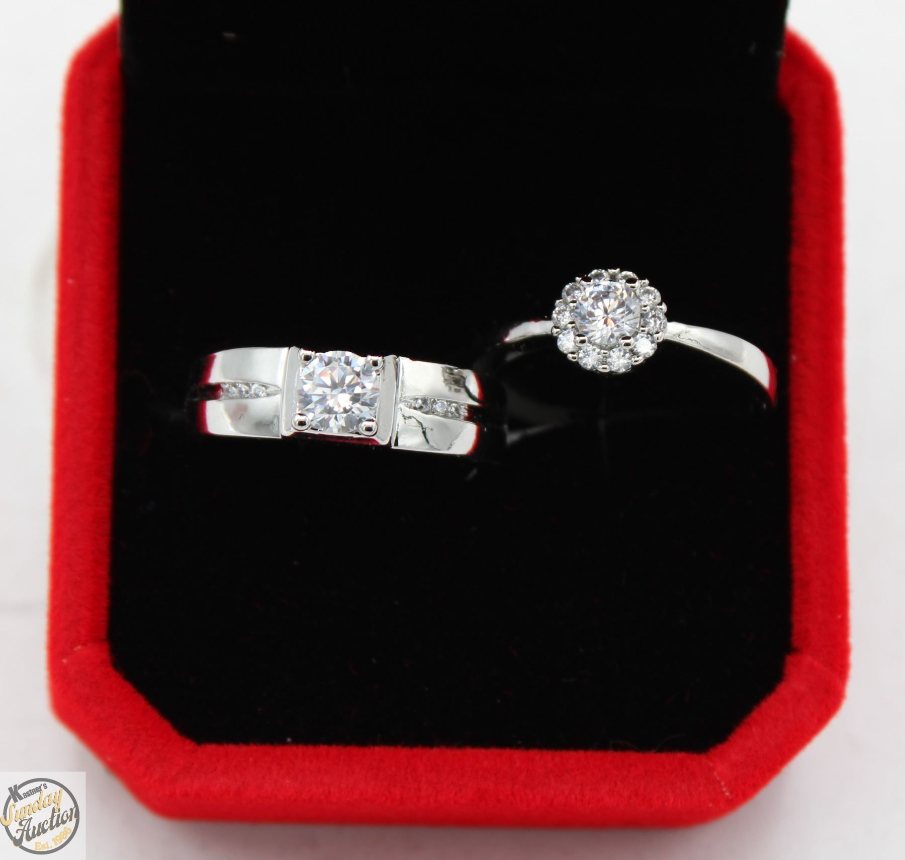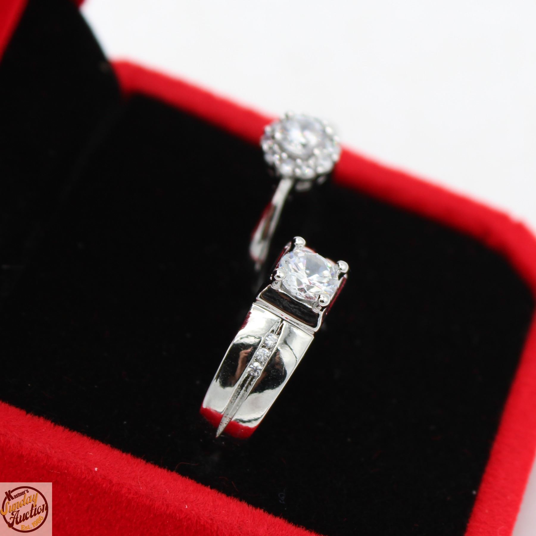 ZIRCONIA SET IN CENTER WITH 6 ROUND BRILLIANT CUT CUBIC ZIRCONIA SET IN SHANKS OF GENTS WITH 0.25 CT CZ SET WITH 10 MORE IN ROUND HALO SET IN 925 SILVER RING SIZE BOTH ADJUSTABLE **ALL ITEMS MUST BE REMOVED BY 5PM SATURDAY, JULY 26th 2025. ALL REMAINING ITEMS WILL BE SUBJECT TO A $6.00 PER DAY STORAGE CHARGE. ANY ITEMS REMAINING AFTER MONDAY, AUGUST 11TH 2025 WILL BE CONSIDERED FORFEITED. NO REFUNDS WILL BE ISSUED FOR FORFEITED ITEMS. TO SCHEDULE A PICK UP APPOINTMENT CLICK HERE