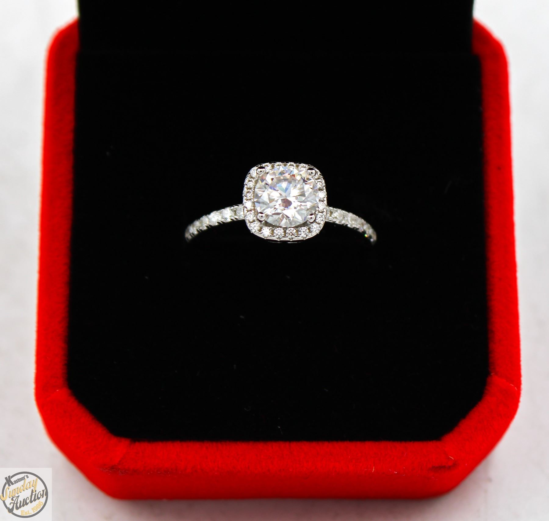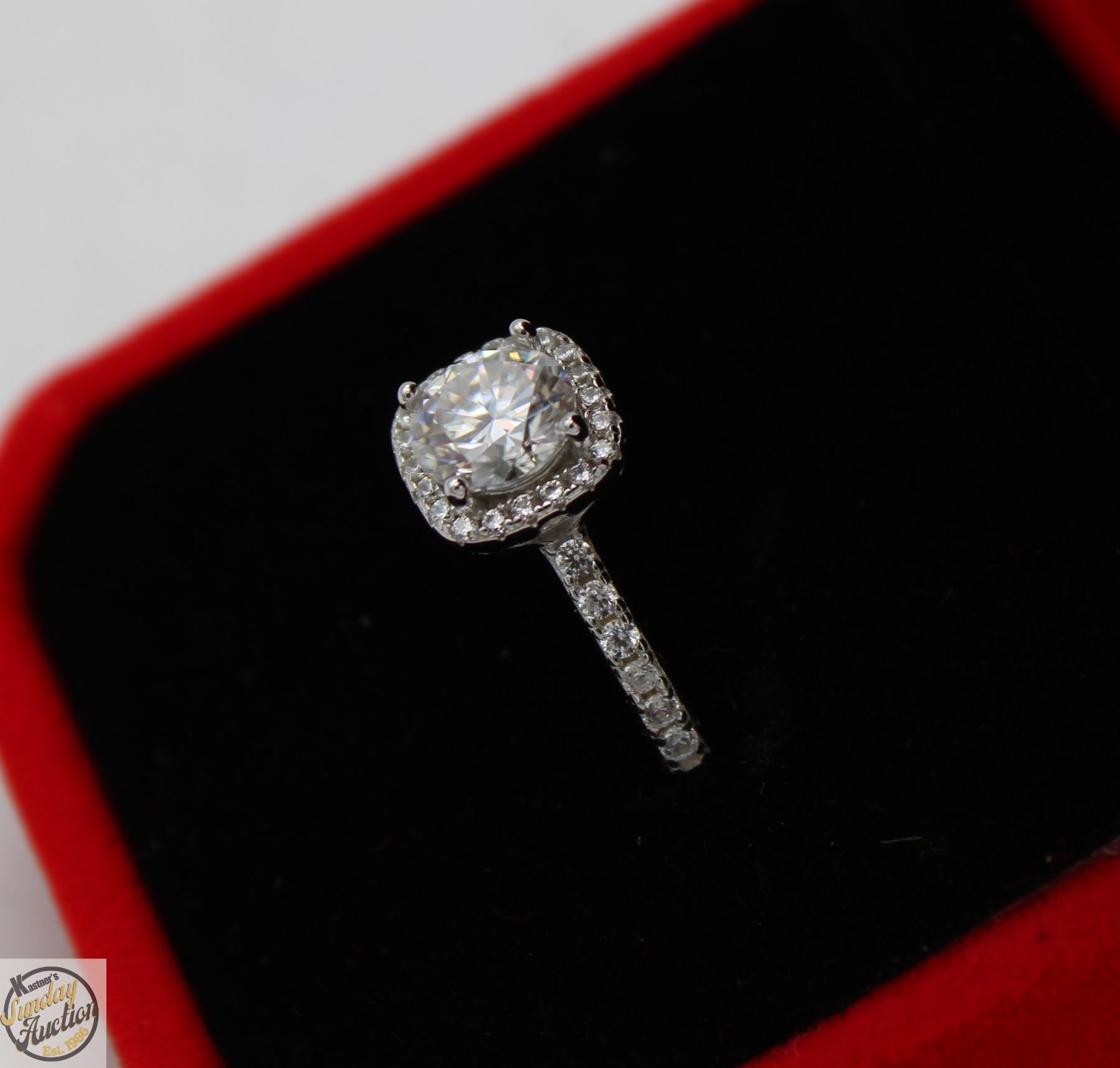 CUT MOISSANITE STONE VVS D COLOR SET WITH 32 ROUND BRILLIANT CUT CUBIC ZIRCONIA SET SQUARE HALO WITH SOME SET IN SHANKS SET IN 925 SILVER RING SIZE 6 **ALL ITEMS MUST BE REMOVED BY 5PM SATURDAY, JULY 26th 2025. ALL REMAINING ITEMS WILL BE SUBJECT TO A $6.00 PER DAY STORAGE CHARGE. ANY ITEMS REMAINING AFTER MONDAY, AUGUST 11TH 2025 WILL BE CONSIDERED FORFEITED. NO REFUNDS WILL BE ISSUED FOR FORFEITED ITEMS. TO SCHEDULE A PICK UP APPOINTMENT CLICK HERE