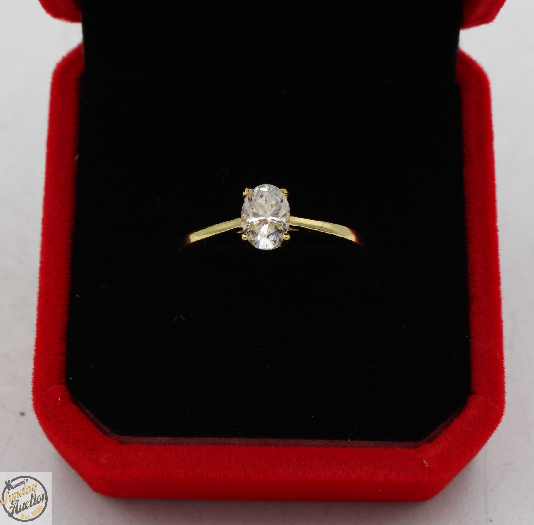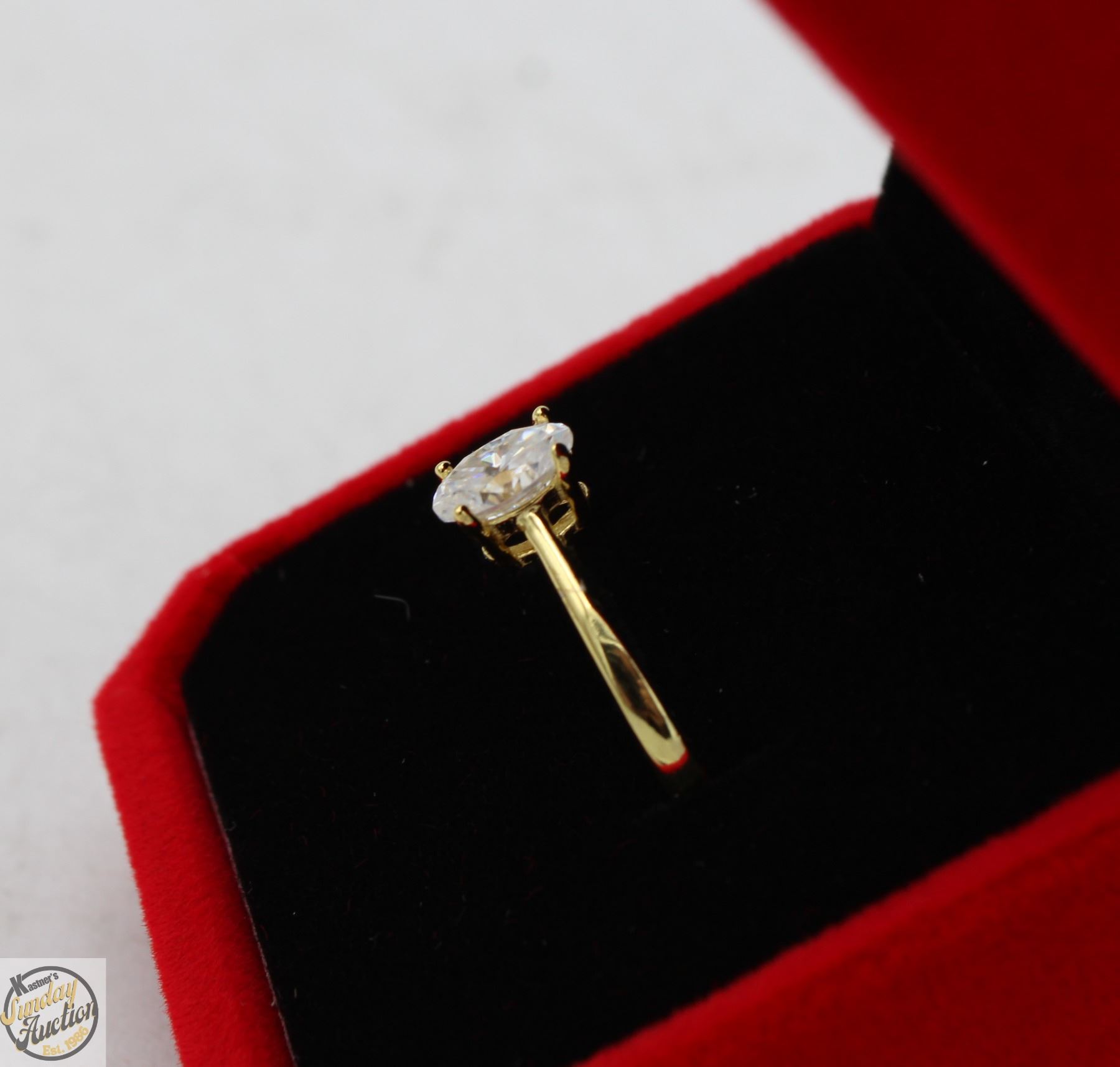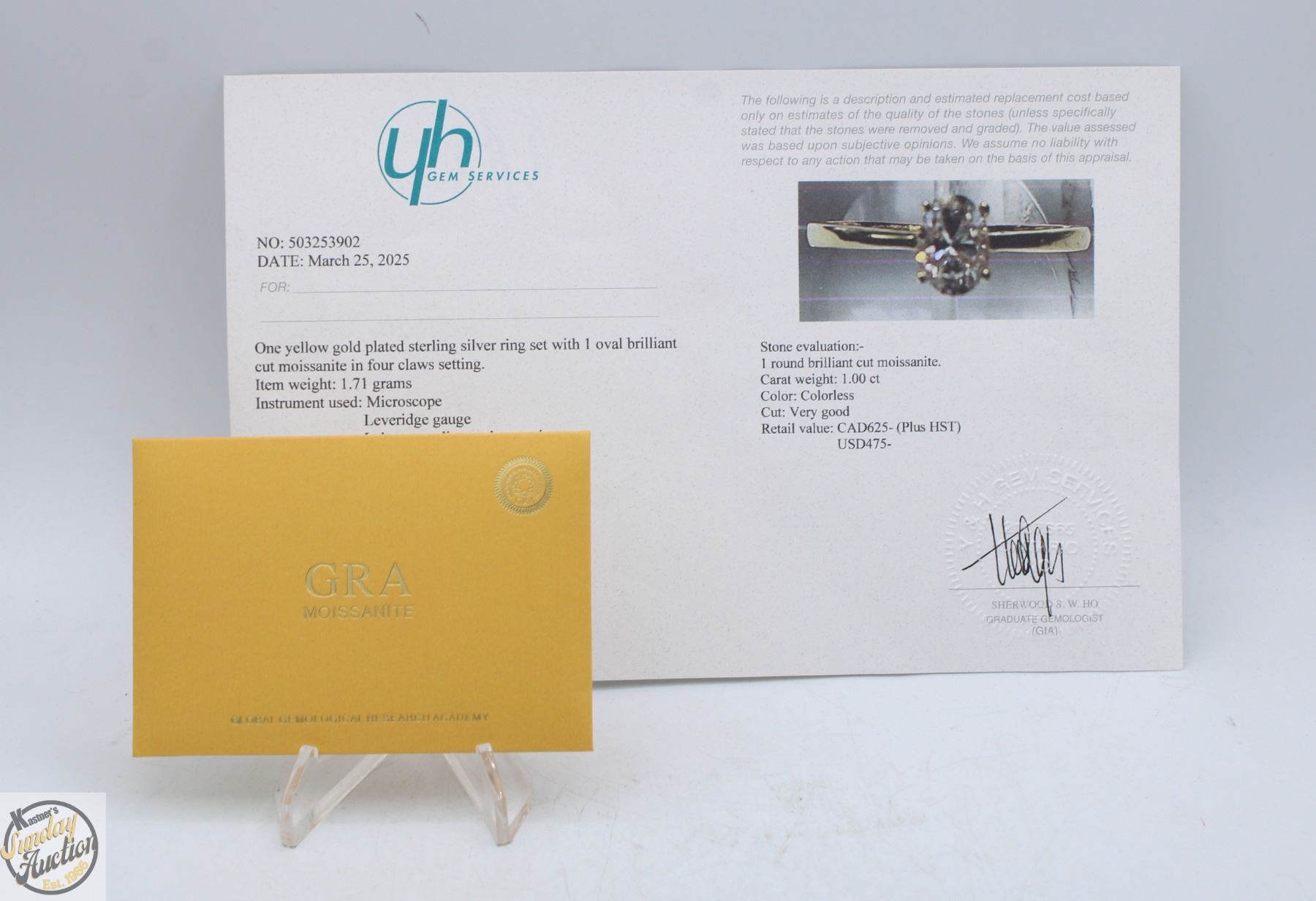 MOISSANITE STONE VVS D COLOR SET IN 4 CLAW HEAD SET IN YELLOW GOLD PLATED 925 SILVER RING SIZE 9 RETAIL VALUE $625.00 **ALL ITEMS MUST BE REMOVED BY 5PM SATURDAY, JULY 26th 2025. ALL REMAINING ITEMS WILL BE SUBJECT TO A $6.00 PER DAY STORAGE CHARGE. ANY ITEMS REMAINING AFTER MONDAY, AUGUST 11TH 2025 WILL BE CONSIDERED FORFEITED. NO REFUNDS WILL BE ISSUED FOR FORFEITED ITEMS. TO SCHEDULE A PICK UP APPOINTMENT CLICK HERE
