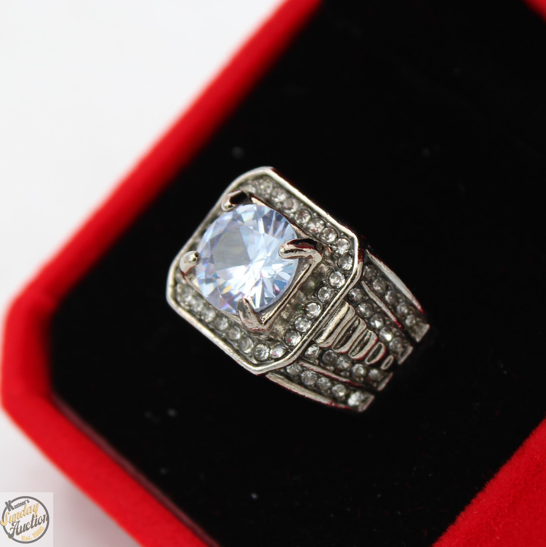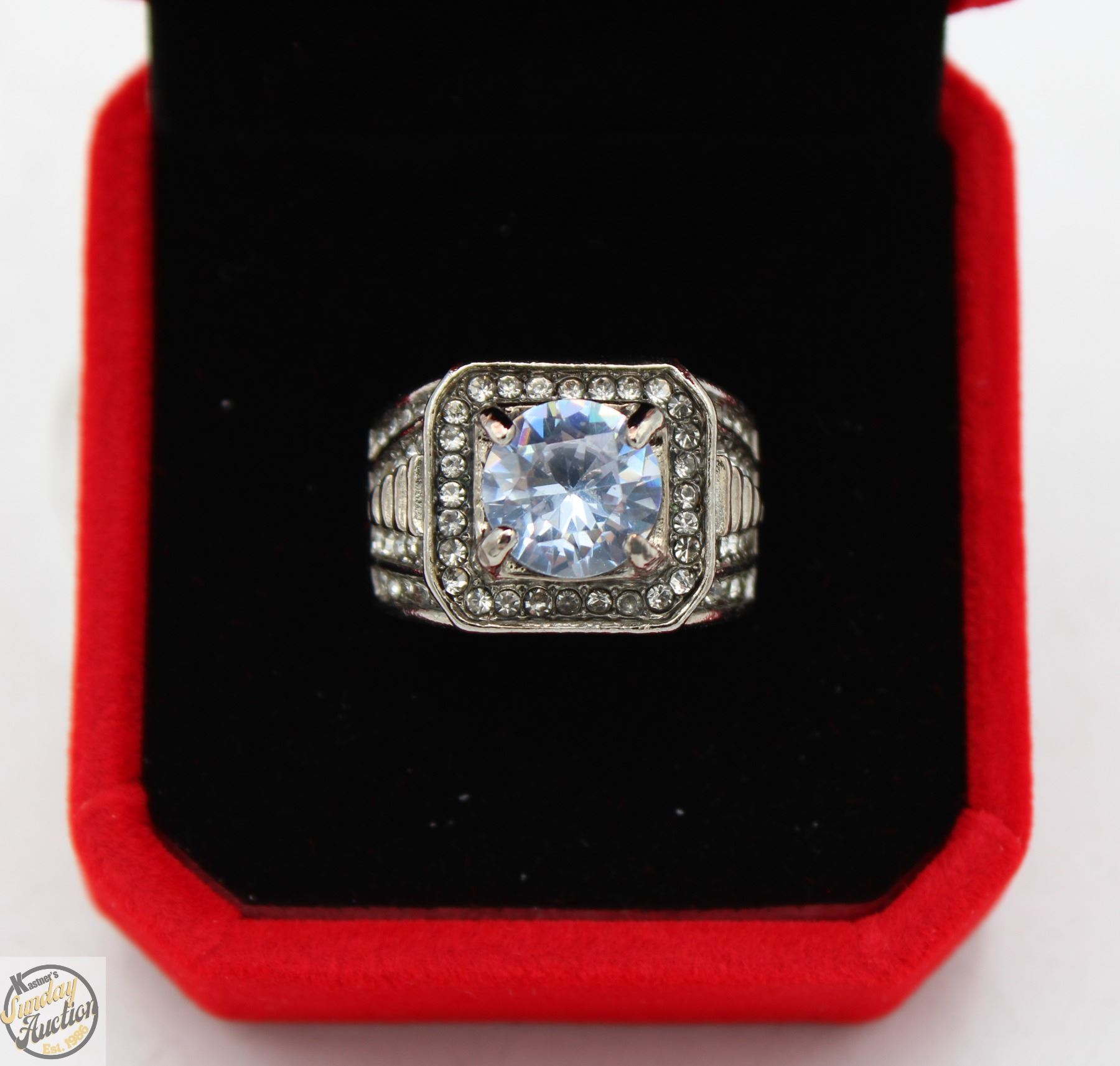 STONE SET WITH 68 ROUND BRILLIANT CUT CLEAR STONES SET SQUARE HALO WITH MORE SET IN SHANKS SET IN 925 SILVER RING SIZE 8 **ALL ITEMS MUST BE REMOVED BY 5PM SATURDAY, JULY 26th 2025. ALL REMAINING ITEMS WILL BE SUBJECT TO A $6.00 PER DAY STORAGE CHARGE. ANY ITEMS REMAINING AFTER MONDAY, AUGUST 11TH 2025 WILL BE CONSIDERED FORFEITED. NO REFUNDS WILL BE ISSUED FOR FORFEITED ITEMS. TO SCHEDULE A PICK UP APPOINTMENT CLICK HERE