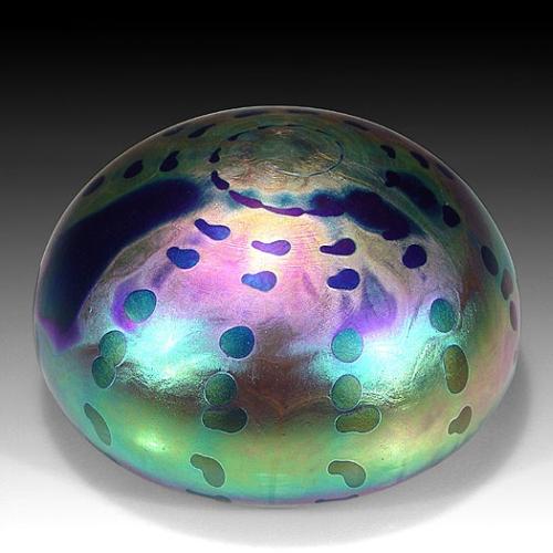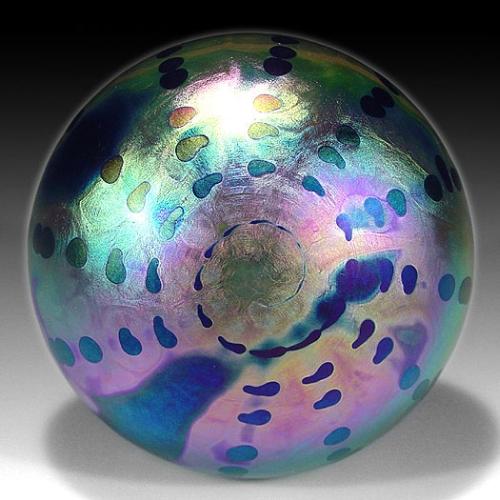 Miscellaneous hollow paperweight with radiating blue dots on an iridescent gold surface. Diameter 3 1/8". NO RESERVE