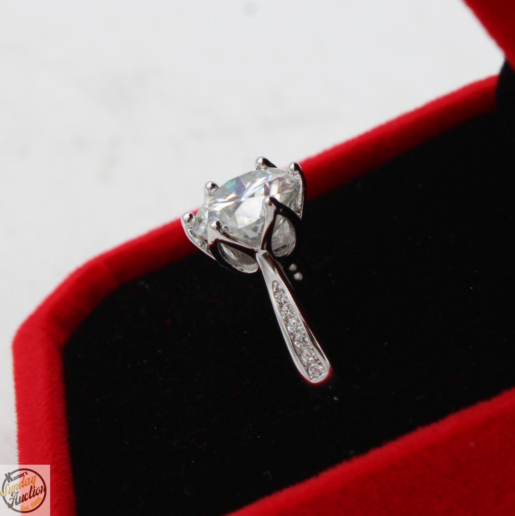 CUT MOISSANITE STONE VVS D COLOR WITH 12 ROUND BRILLIANT CUT CUBIC ZIRCONIA SET IN SHANKS SET IN 925 SILVER RING SIZE 6**ALL ITEMS MUST BE REMOVED BY 5PM SATURDAY, JULY 19TH 2025. ALL REMAINING ITEMS WILL BE SUBJECT TO A $6.00 PER DAY STORAGE CHARGE. ANY ITEMS REMAINING AFTER MONDAY, AUGUST 4TH, 2025 WILL BE CONSIDERED FORFEITED. NO REFUNDS WILL BE ISSUED FOR FORFEITED ITEMS. TO SCHEDULE A PICK UP APPOINTMENT CLICK HERE