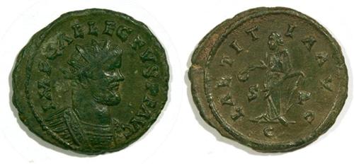 Allectus 293-296 Antoninius of Clausentvin. Reverse Laetitia, gVF. Rare #S3591.