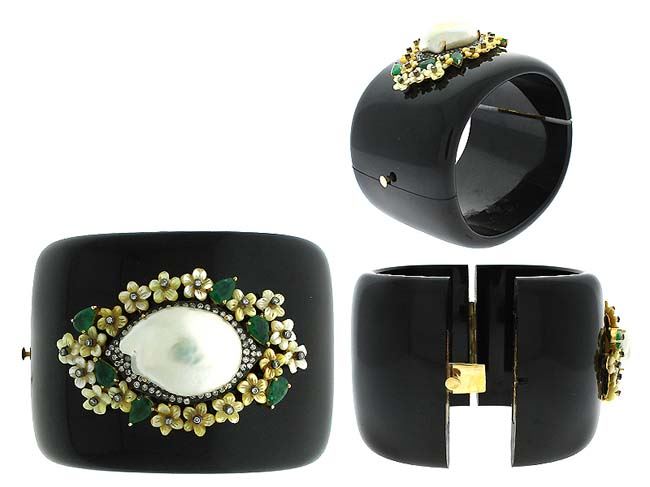 294.63 TCW BAKELITE,PEARL , EMERALD & DIAMOND BANGLE 18K GOLD & SILVER
