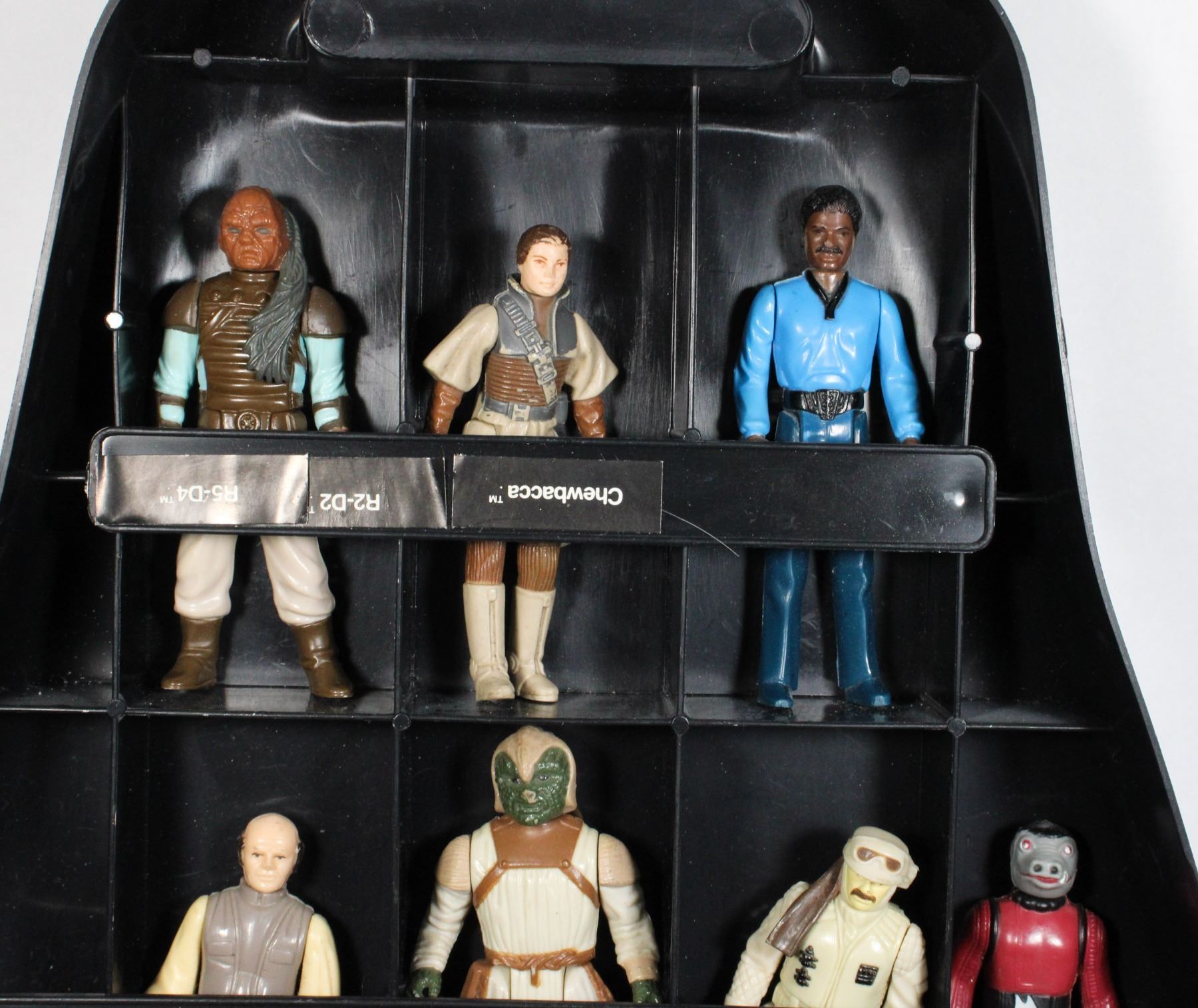 LOT OF 14 KENNER STAR WARS ACTION FIGURES IN 1980 KENNER EMPIRE STRIKES BACK DARTH VADER CASE WHICH HAS 2 OF 3 TABS- INCLUDES PRINCESS LEIA BESPIN LANDO PRUNEFACE LOBOT SNAGGLETOOTH ETC STAR WARS A NEW HOPE THE EMPIRE STRIKES BACK RETURN OF THE JEDI VINTAGE KENNER FIGURE LOT