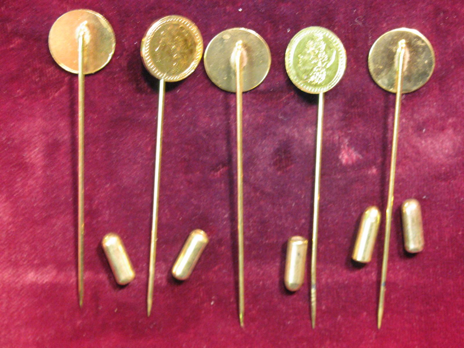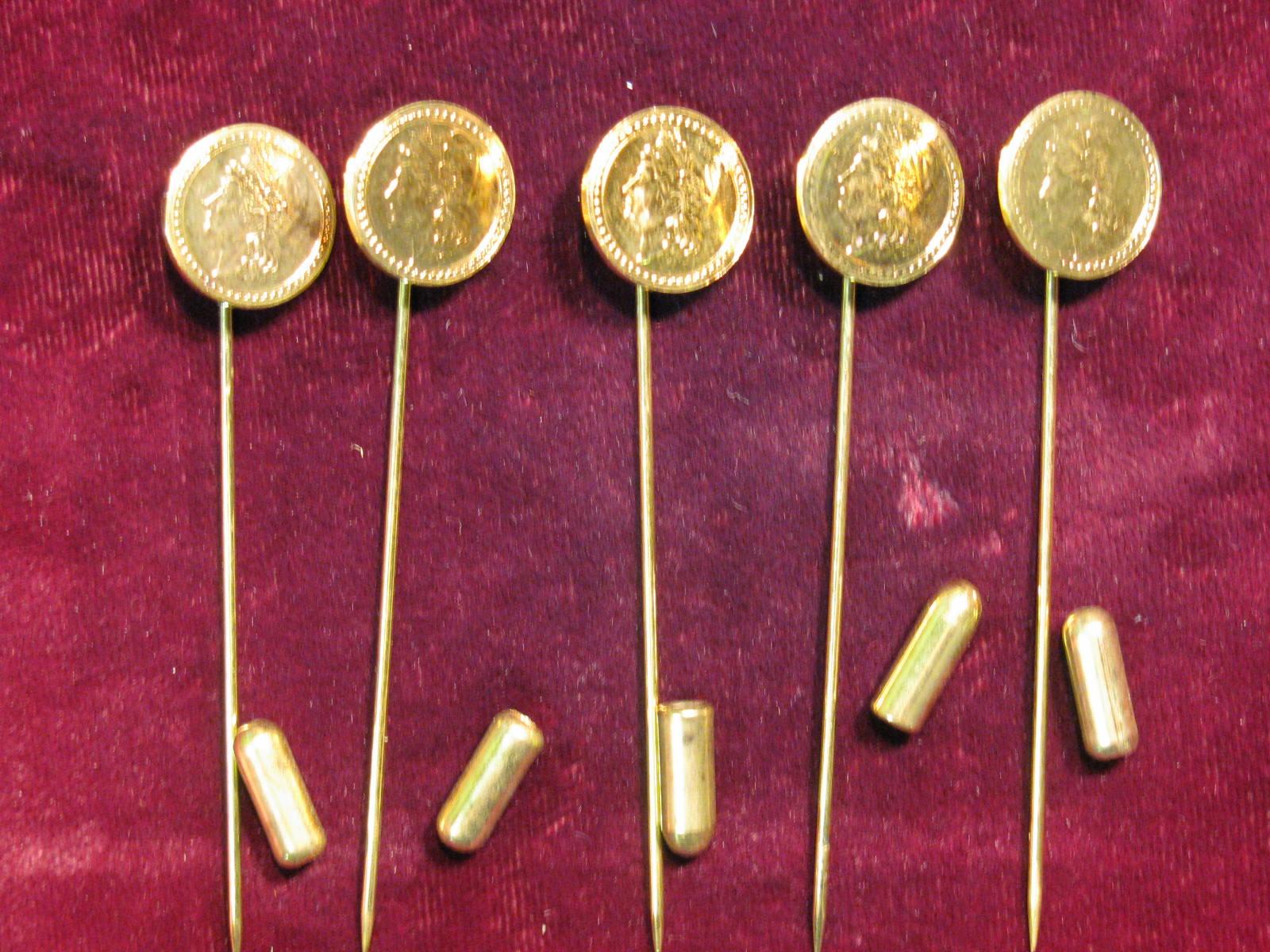 2940. (5) Antique Pattern Gold Coin Stick Pins. Originally sold at coin shows by Art Kagin at $20 each. Total retail value $100.00.