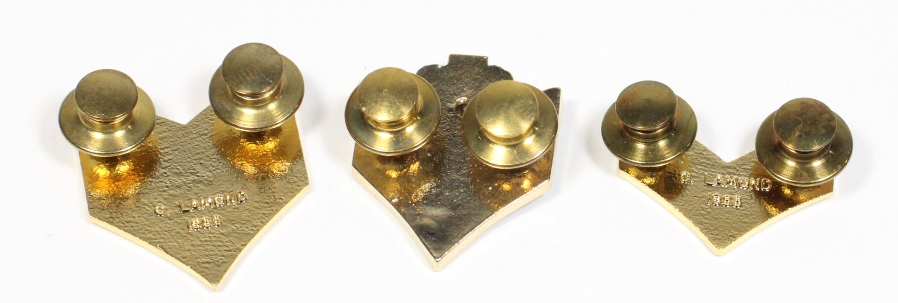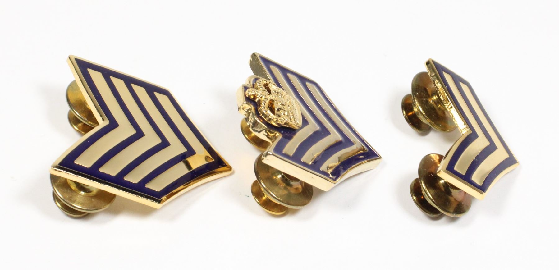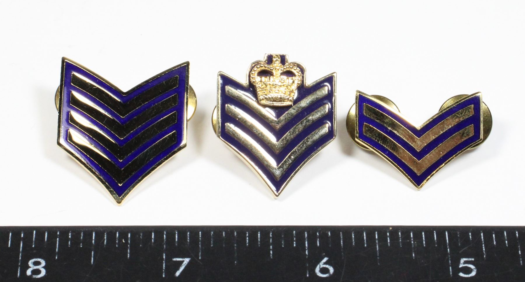 SET OF 3 ROYAL CANADIAN MOUNTED POLICE CHEVRON RANK INSIGNIA, SMALL SIZE METAL W/ ENAMEL DESIGN, THREE DIFFERENT RANKS. ROYAL CANADIAN MOUNTED POLICE INSIGNIA QUEEN ELIZABETH II