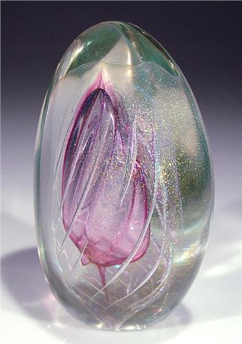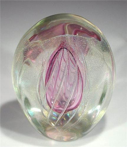 Eickholt Glass 1985 high-domed abstract design paperweight, with a large central egg-shaped translucent pink bubble, encircled by spaced, slanted, shimmering ribbons, and covered with a clear iridescent veil. Signed/dated. Height 5 3/4". NO RESERVE