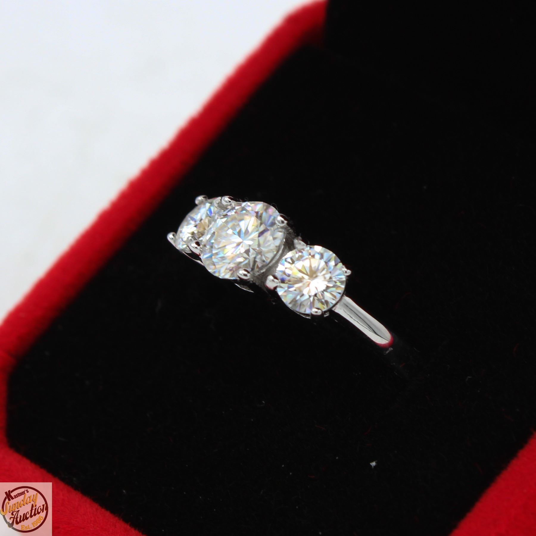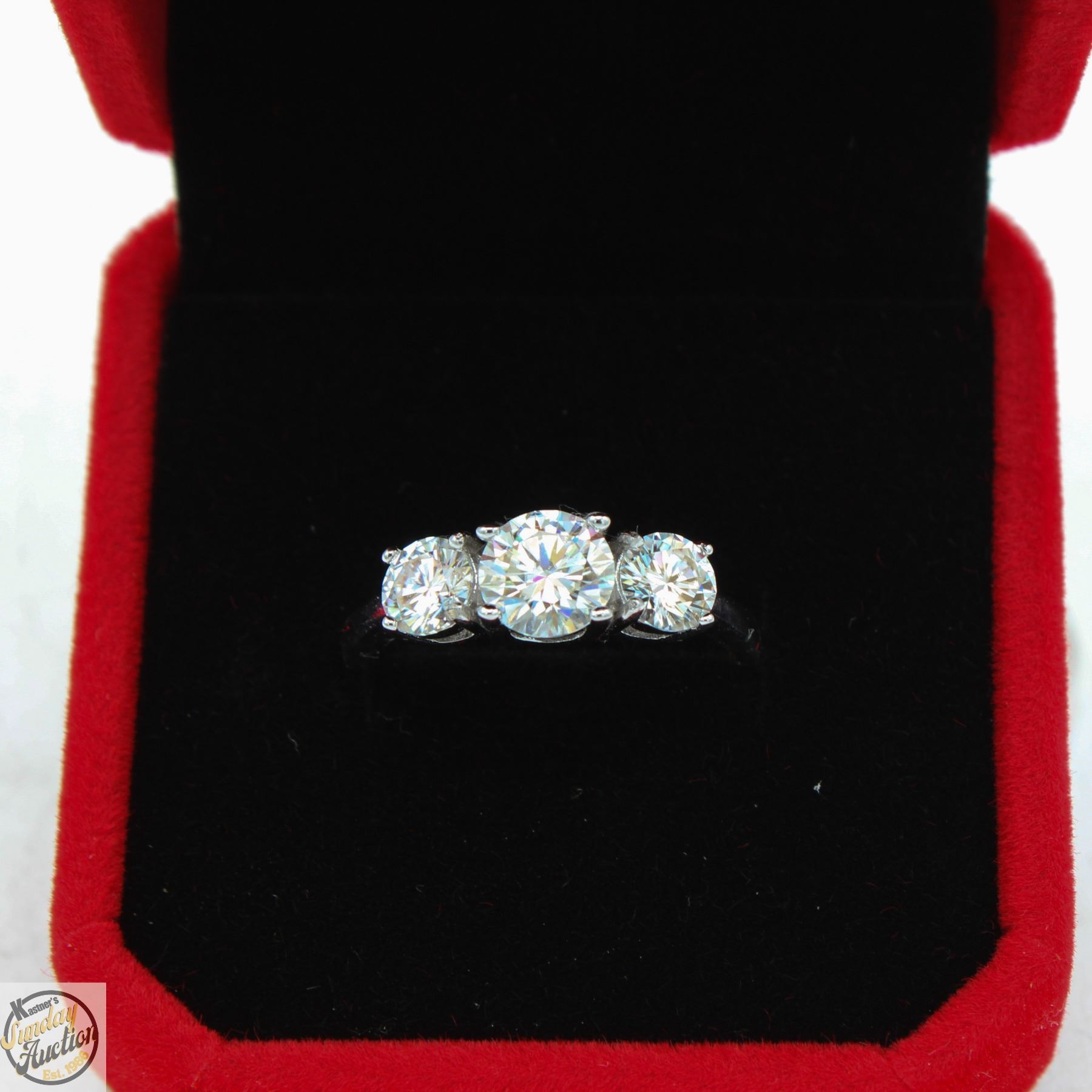 BRILLIANT CUT MOISSANITE STONES VVS D COLOR SET WITH 1.00 CT MOISSANITE SET IN CENTER WITH 0.50 CT SET ON EITHER SIDE SET IN 925 SILVER RING SIZE 8 RETAIL VALUE $950.00 **ALL ITEMS MUST BE REMOVED BY 5PM SATURDAY, AUGUST 9 2025. ALL REMAINING ITEMS WILL BE SUBJECT TO A $6.00 PER DAY STORAGE CHARGE. ANY ITEMS REMAINING AFTER MONDAY, AUGUST 25TH 2025 WILL BE CONSIDERED FORFEITED. NO REFUNDS WILL BE ISSUED FOR FORFEITED ITEMS. TO SCHEDULE A PICK UP APPOINTMENT CLICK HERE