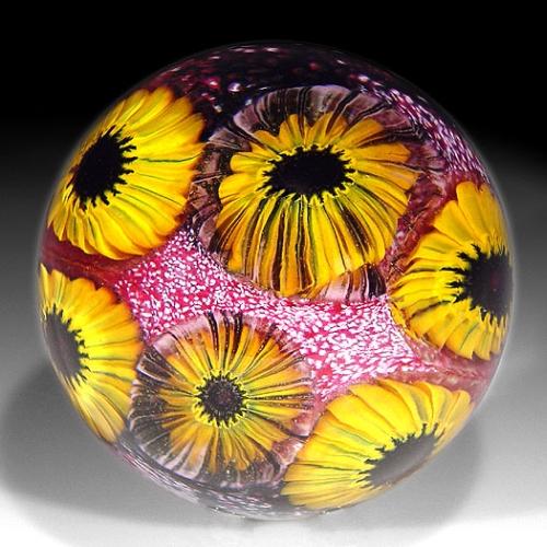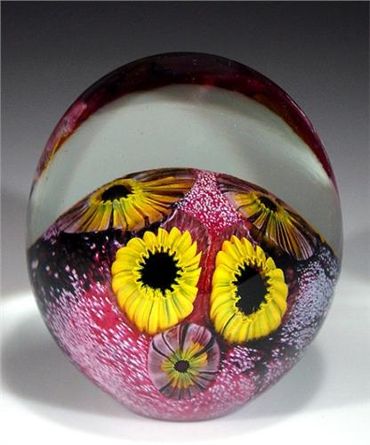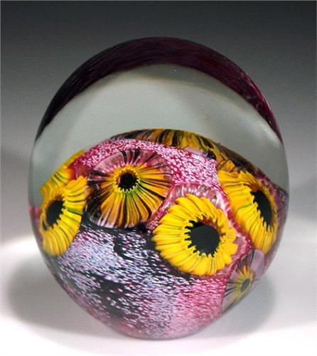 Eickholt Glass 1995 high-domed paperweight, with yellow and black anemones covering the surface of a mottled red, black, and white cushion. Signed/dated. Height 3 3/4". NO RESERVE