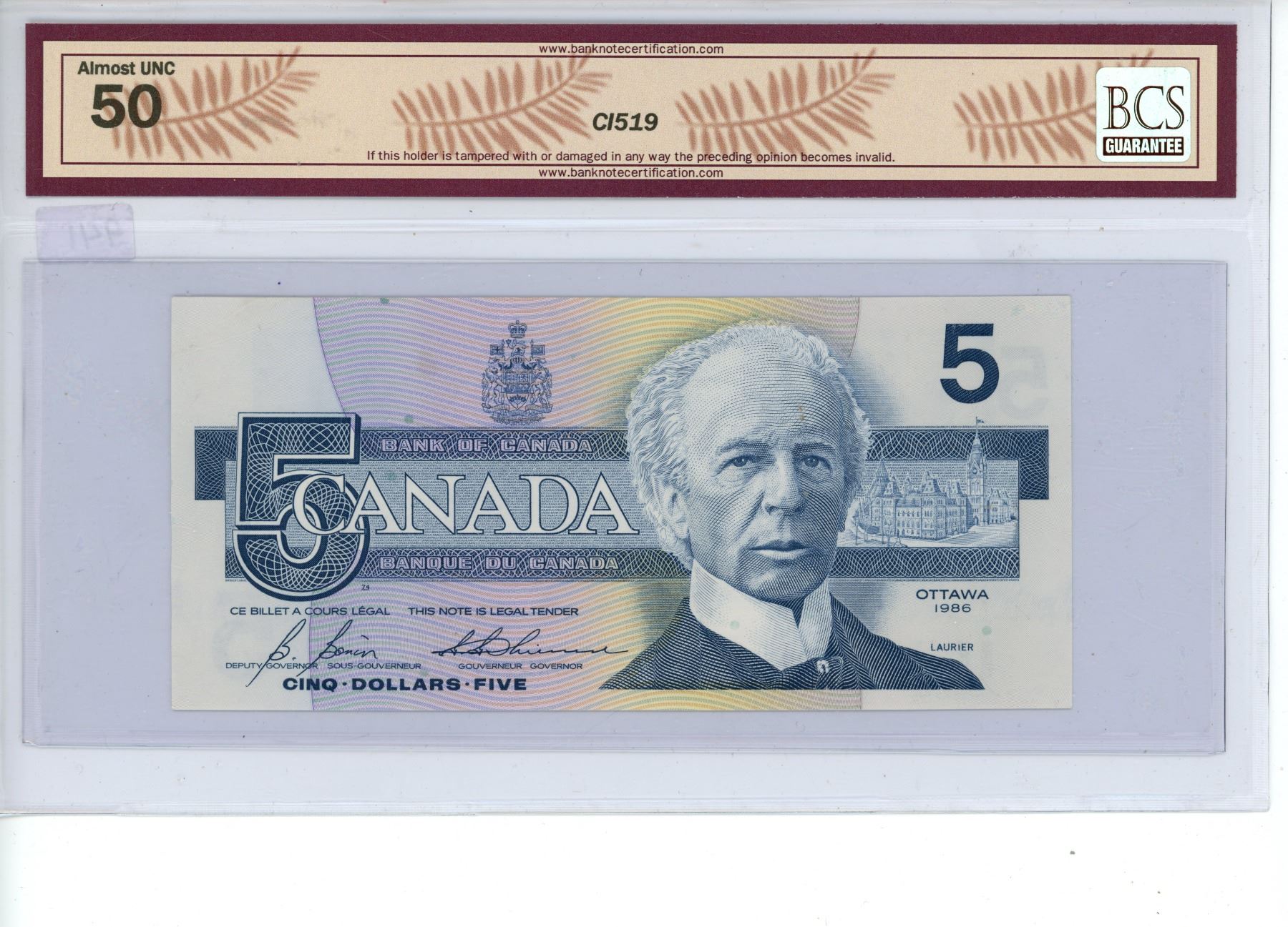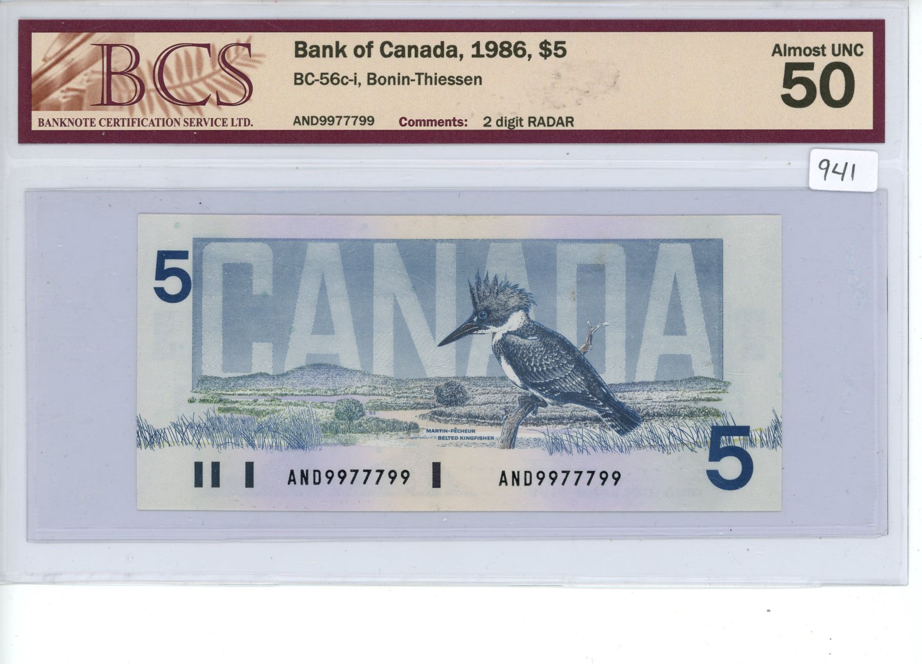 2986 Canadian $5 Bill - BCS Graded, 2 digit Radar Serial #, almost UNC 50