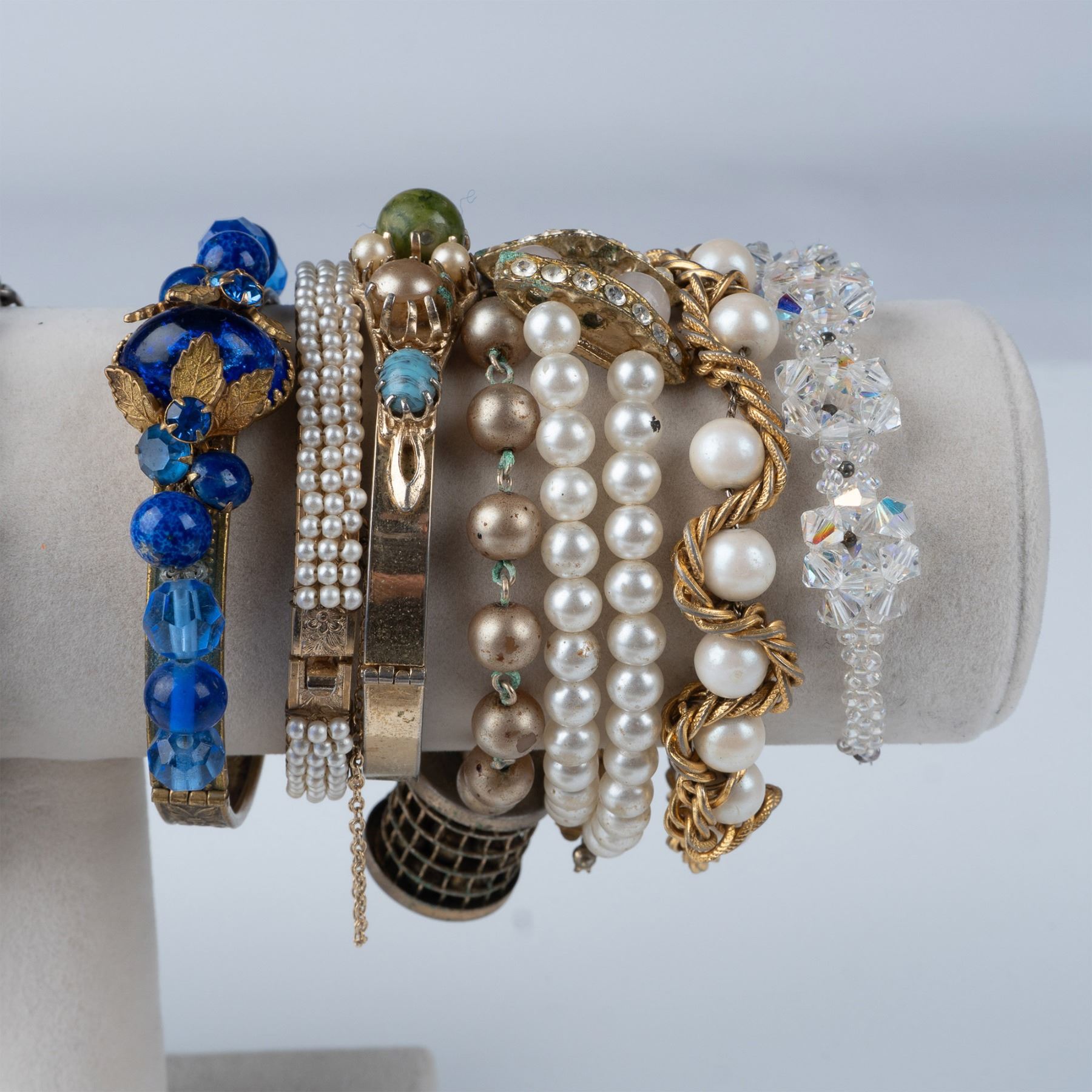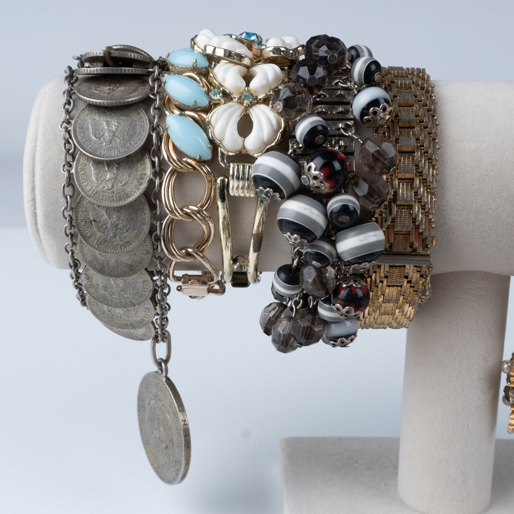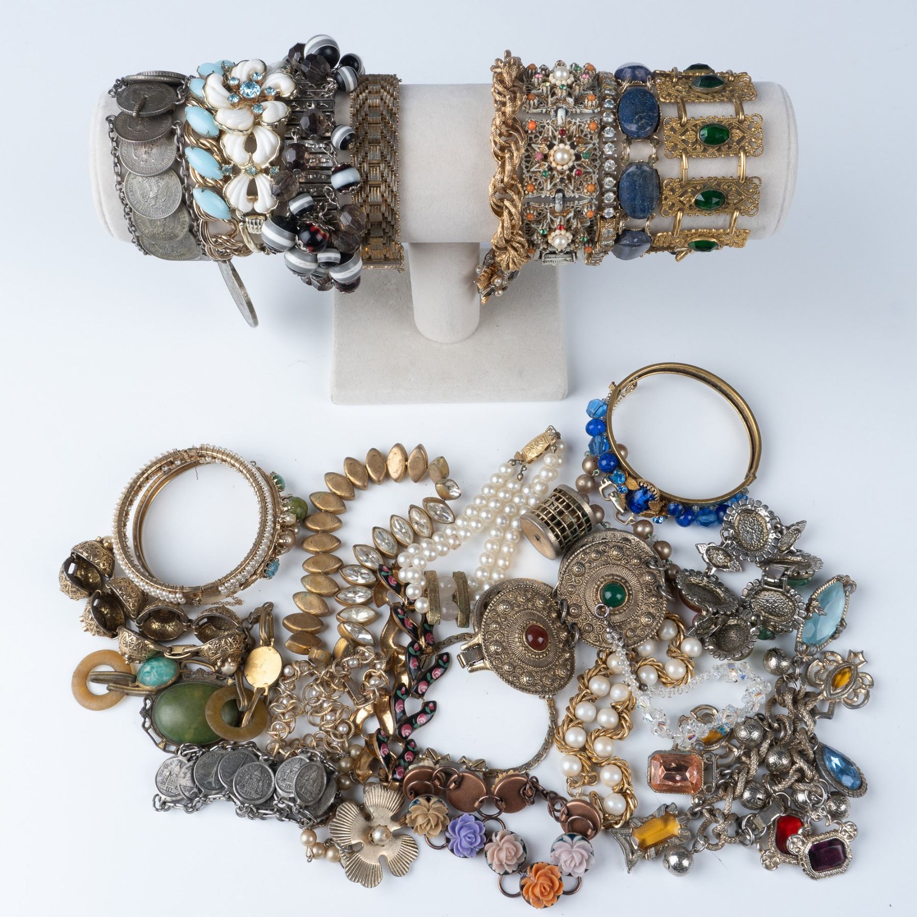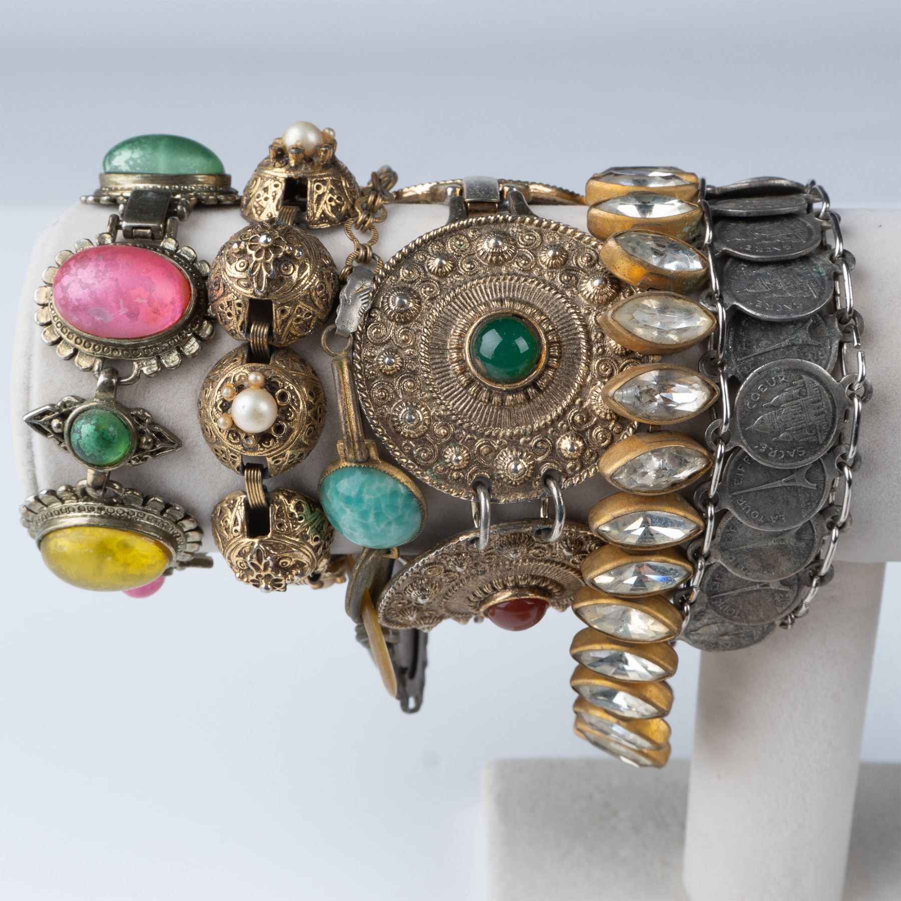 This diverse collection of 29 vintage bracelets showcases a blend of boho and elegant styles, featuring a mix of materials such as pearl, enamel, and metal. Highlights include a statement bracelet adorned with green and blue beads, intricate coin-style bracelets, and beautifully crafted pieces with floral accents.