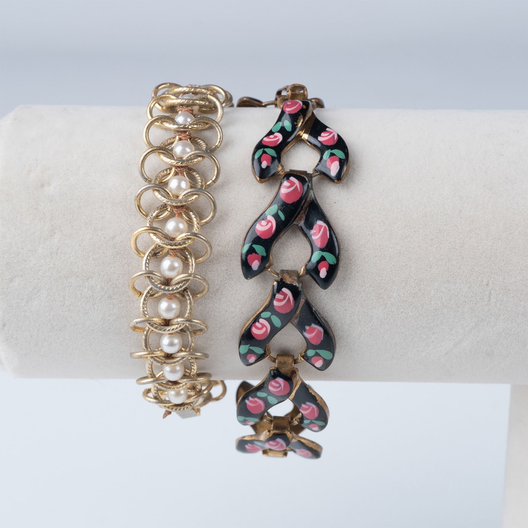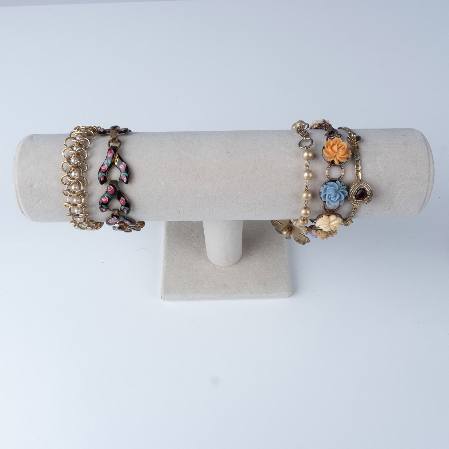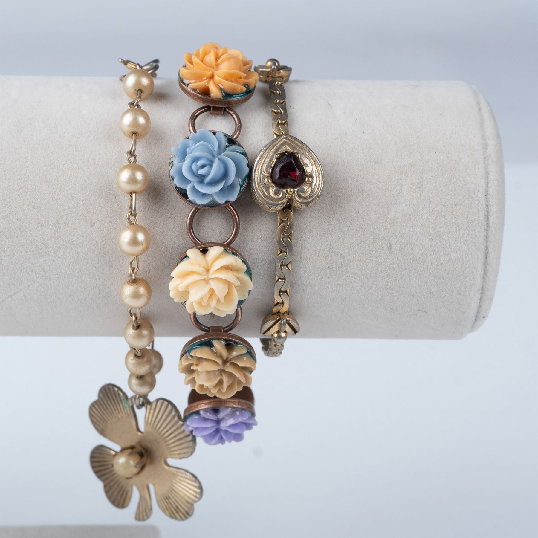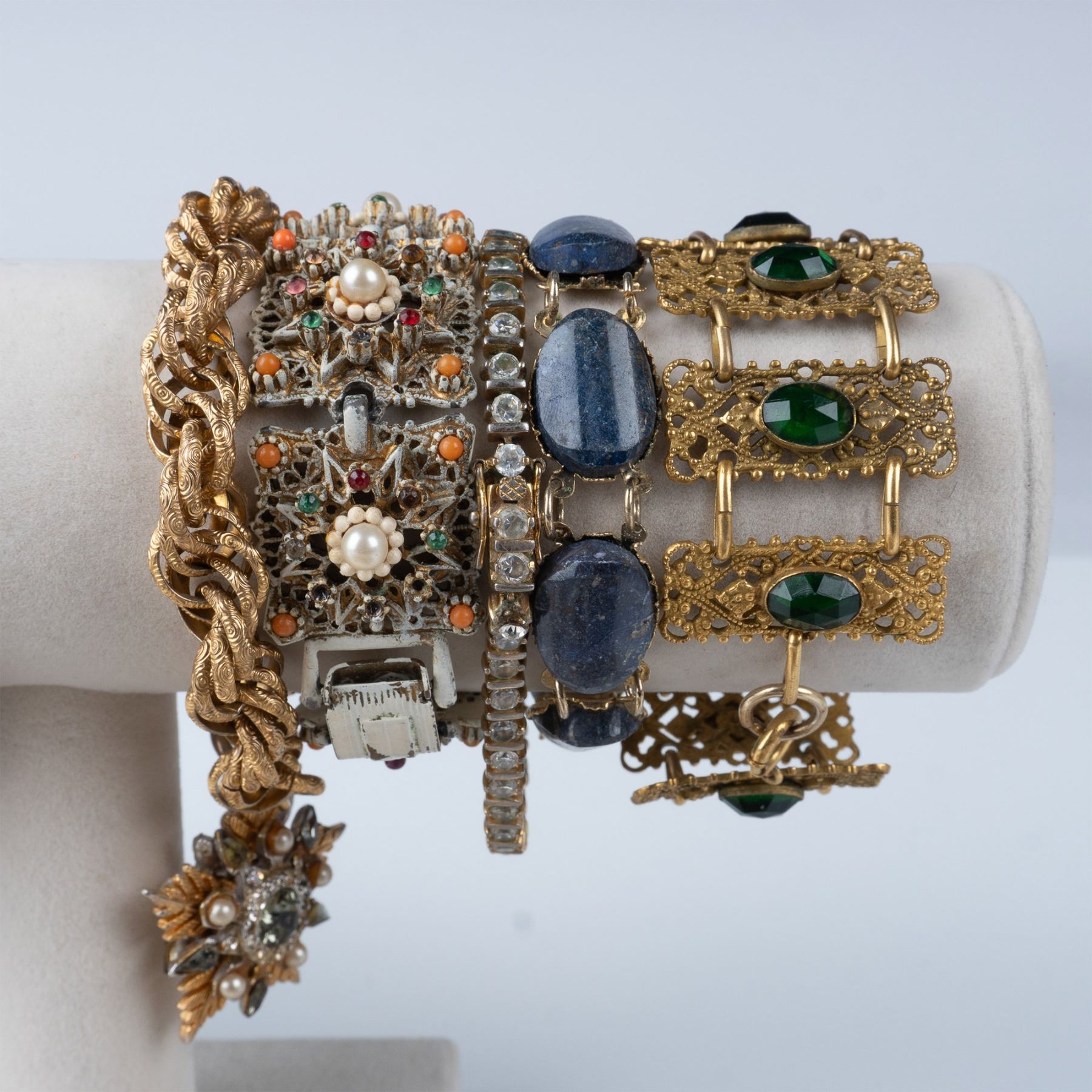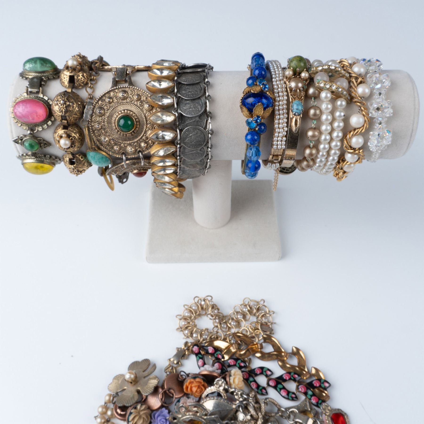 This diverse collection of 29 vintage bracelets showcases a blend of boho and elegant styles, featuring a mix of materials such as pearl, enamel, and metal. Highlights include a statement bracelet adorned with green and blue beads, intricate coin-style bracelets, and beautifully crafted pieces with floral accents.