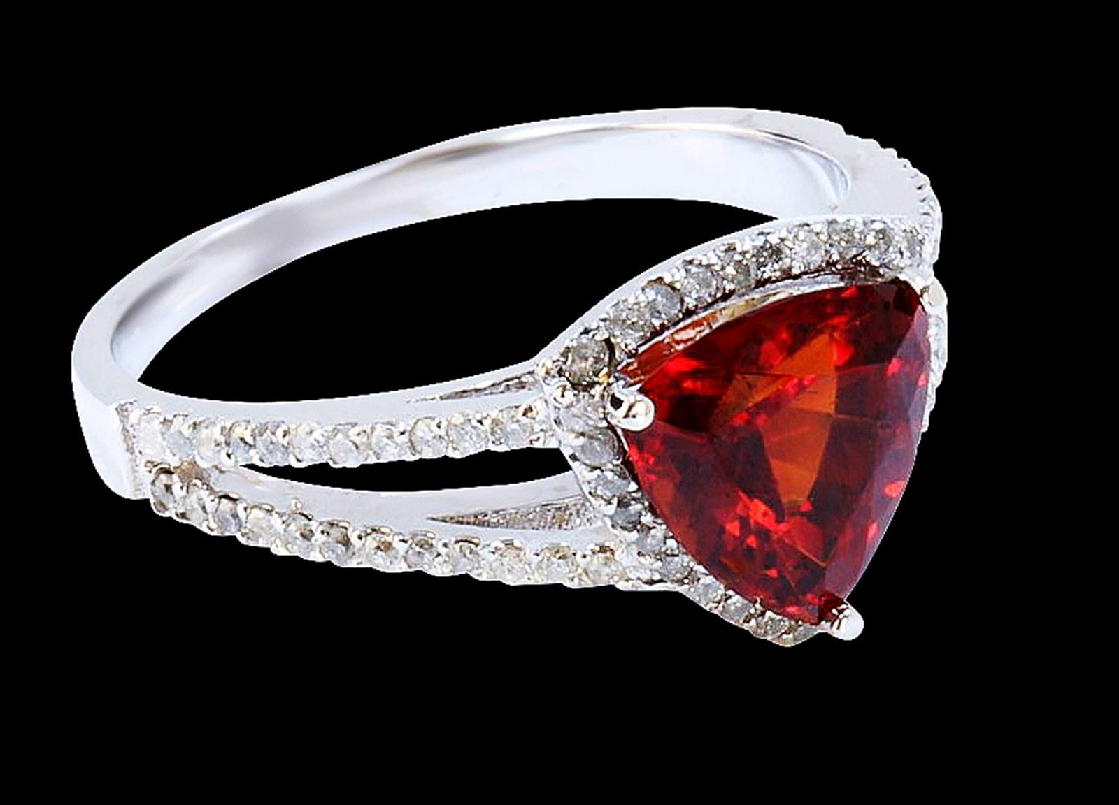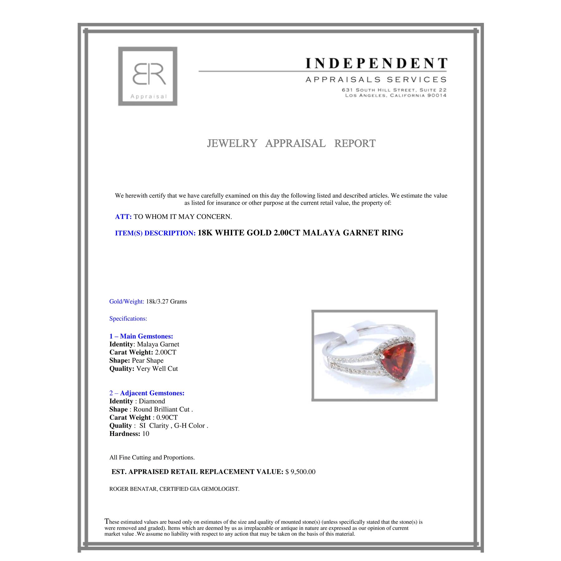 18K WHITE GOLD MALAYA GARNET RING3.27GRAMS/DIAMOND0.90CT/MALAYA GARNET:2CT/#GVR1047/MALAYA GARNET IS THE VERY RARE GARNET IN THE GARNET FAMILY. VERY HARD TO FIND THIS KIND OF COLOR AND QULAITY **This striking 2ct pear shape Malaya Garnet casts a vibrant red, stimulating all aspects of one's creative abilities and energies. The brilliant hue is brightened by a glittering round 0.90ct round brilliant cut Diamond accent surround and the stepped detailing on the sides of the shank adds textural appeal.**