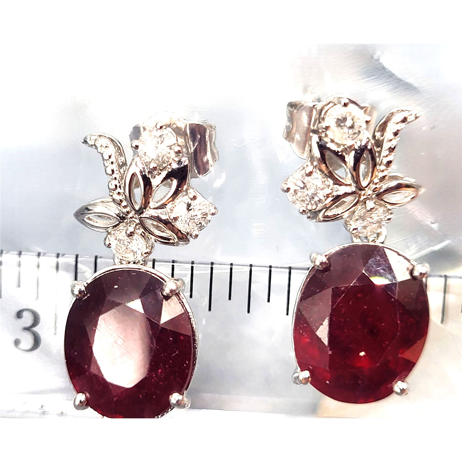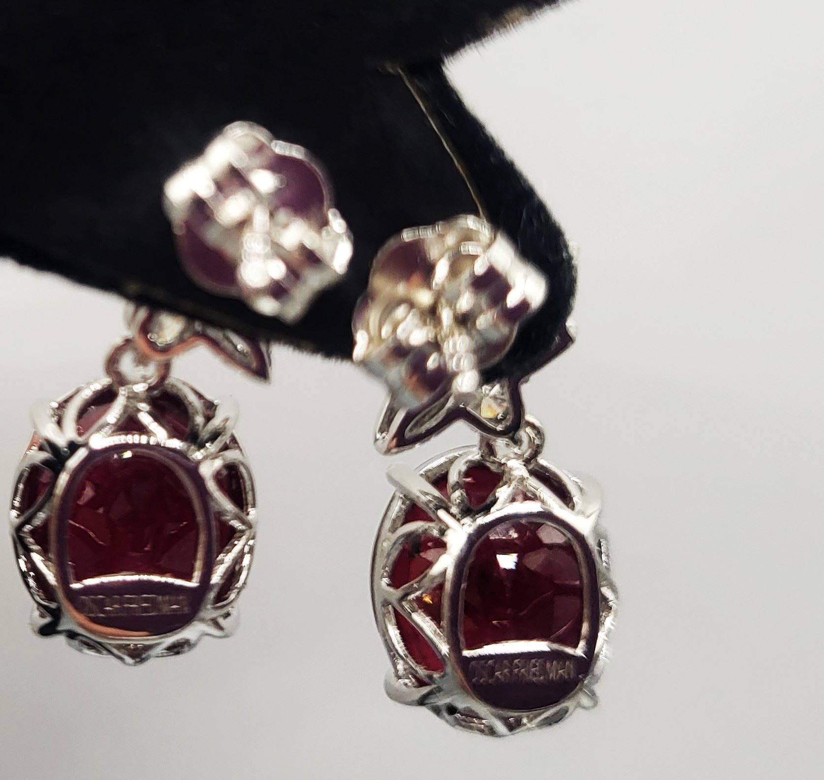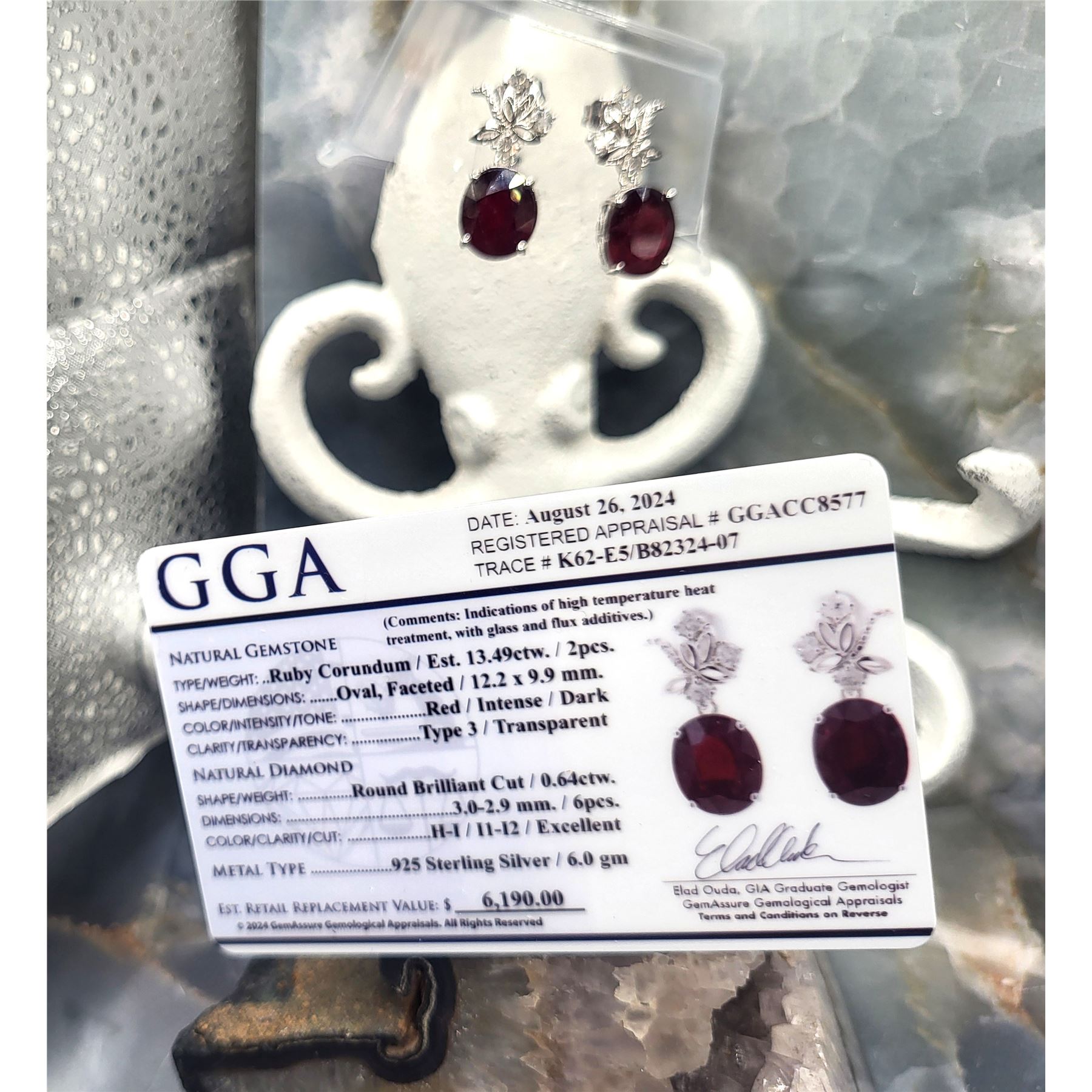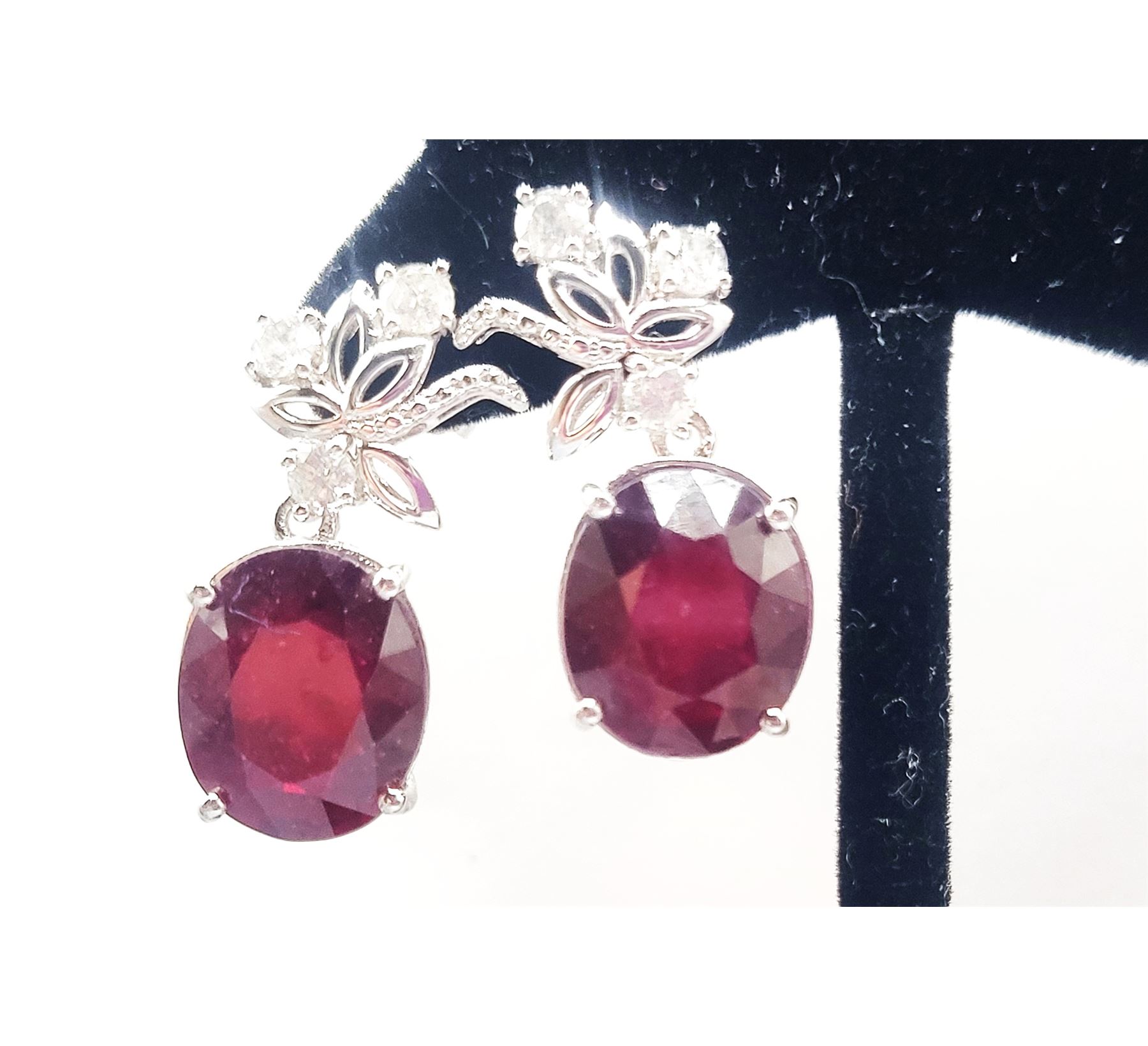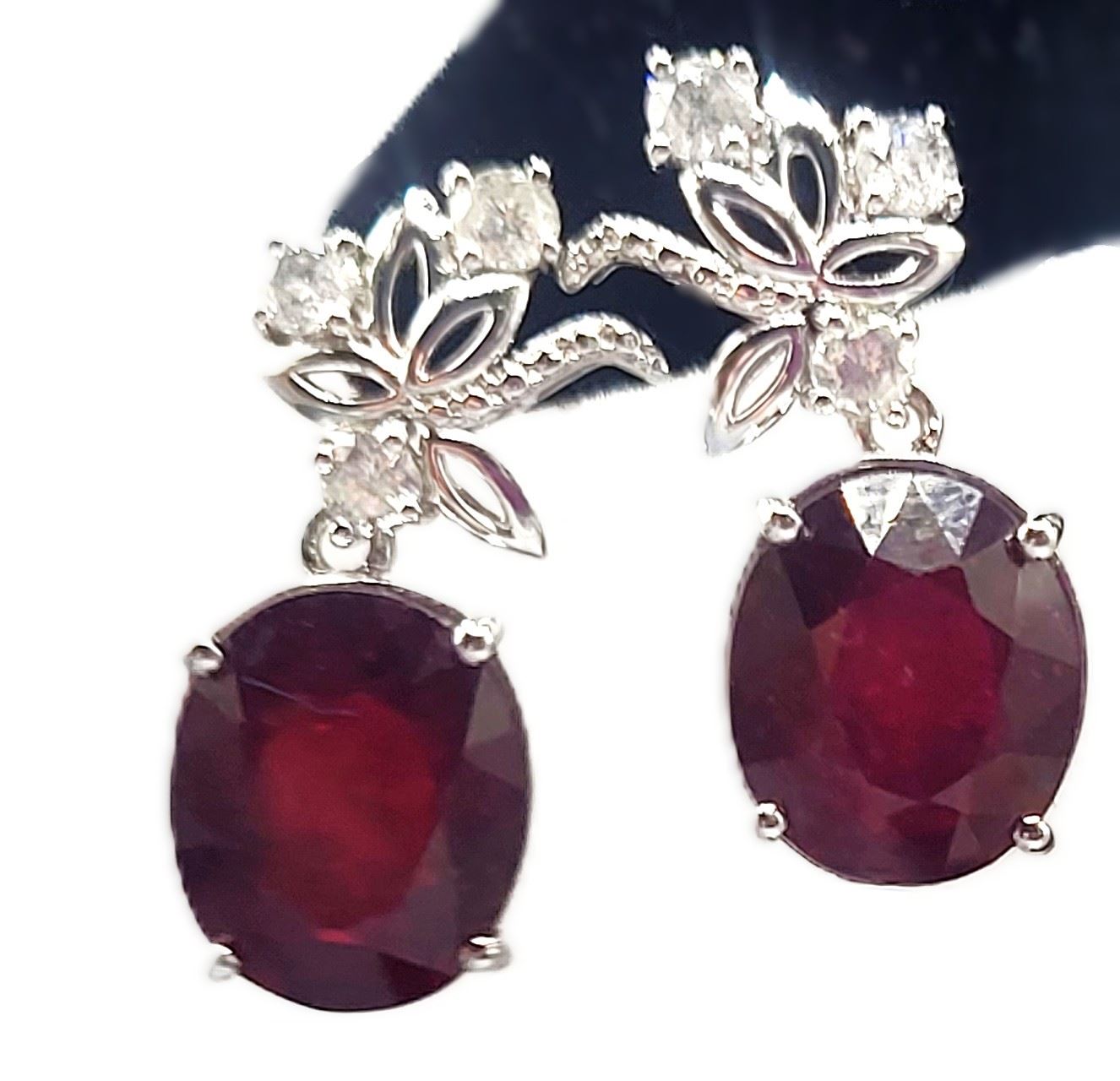 These sterling silver dangling earrings are so fancy, yet frivolous with a surprisingly low reserve (undisclosed at consignor's discretion).& nbsp; Each earring is prong-set with an approximate 6.50 carat oval-cut ruby corundum* and is topped with fancy swirls of sterling silver with three round, brilliant-cut, H-I color, I1-I2 clarity, .10 carat diamonds, for a total of 13.49 carats total weight ruby corundum* and .64 carats total weight diamonds.& nbsp; The earrings hang approximately 1 1/8& quot; and attach to the earlobe with posts and friction backs.& nbsp; Admin: ER000200/lag