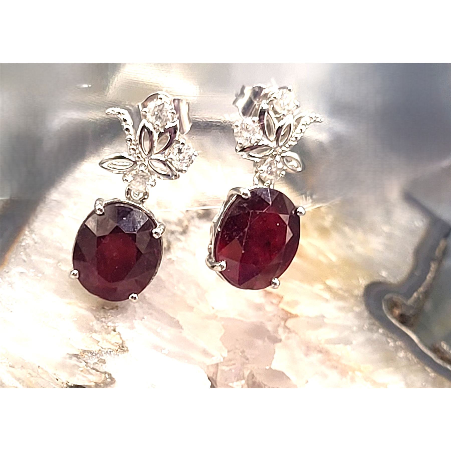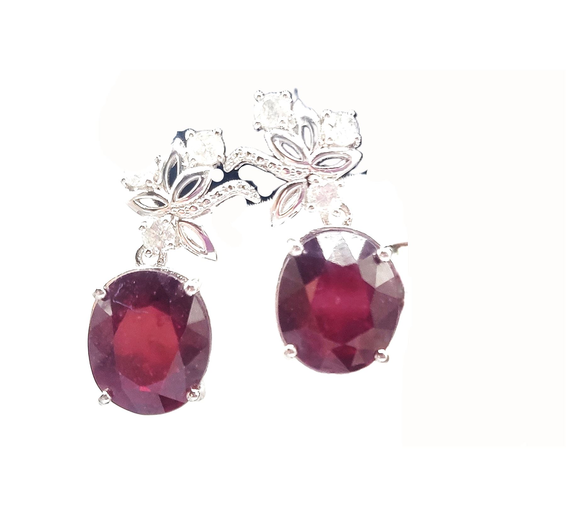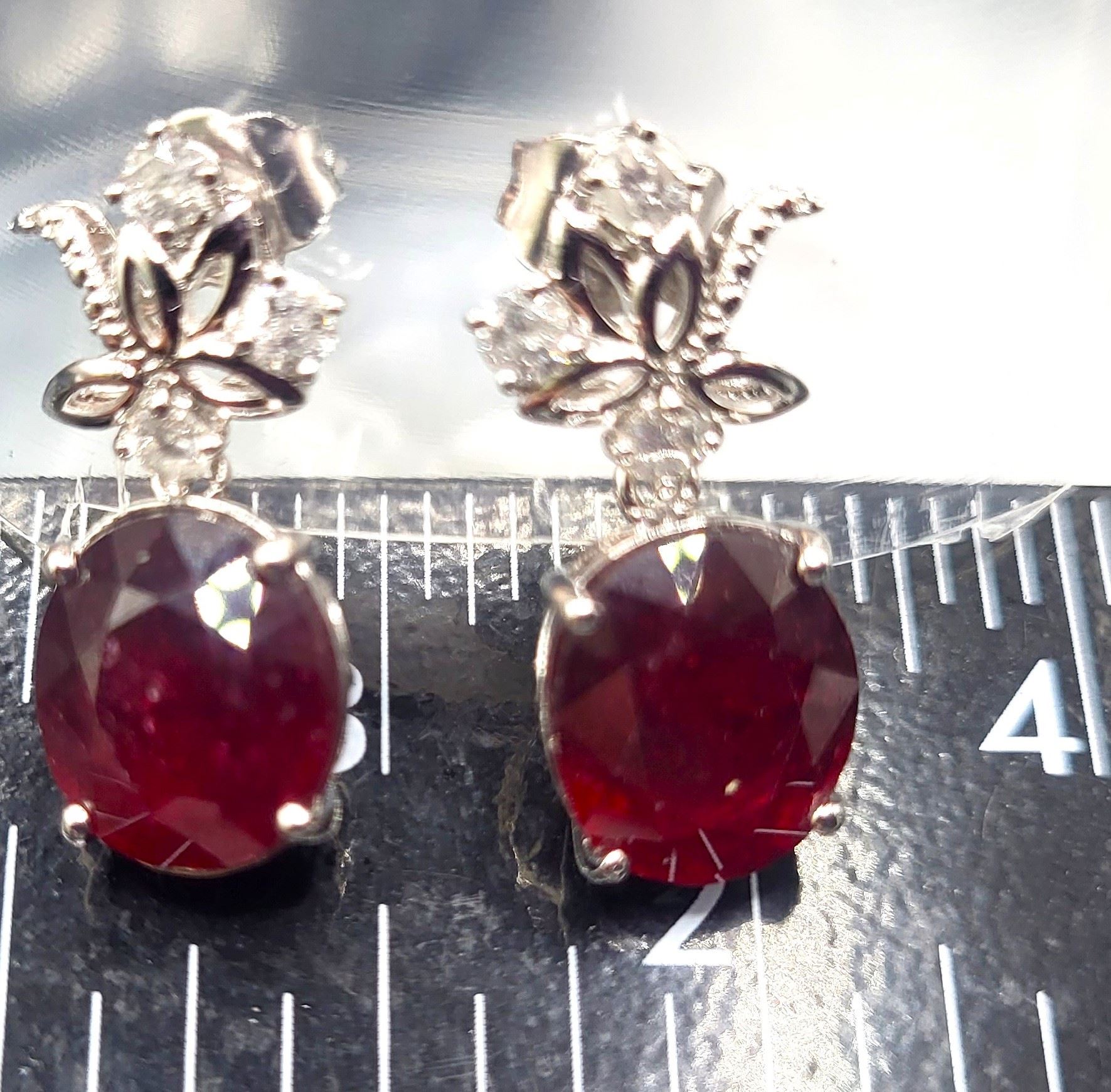 These sterling silver dangling earrings are so fancy, yet frivolous with a surprisingly low reserve (undisclosed at consignor's discretion).& nbsp; Each earring is prong-set with an approximate 6.50 carat oval-cut ruby corundum* and is topped with fancy swirls of sterling silver with three round, brilliant-cut, H-I color, I1-I2 clarity, .10 carat diamonds, for a total of 13.49 carats total weight ruby corundum* and .64 carats total weight diamonds.& nbsp; The earrings hang approximately 1 1/8& quot; and attach to the earlobe with posts and friction backs.& nbsp; Admin: ER000200/lag