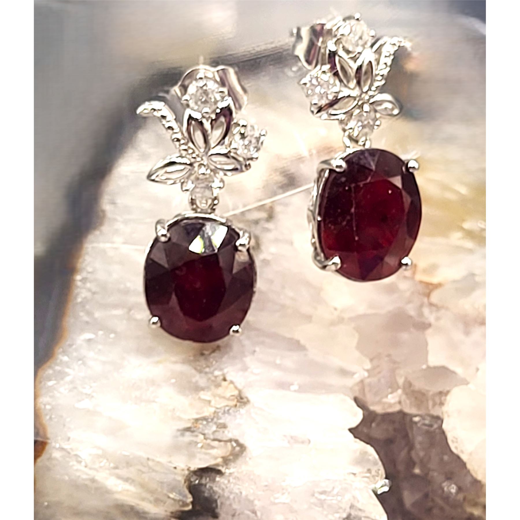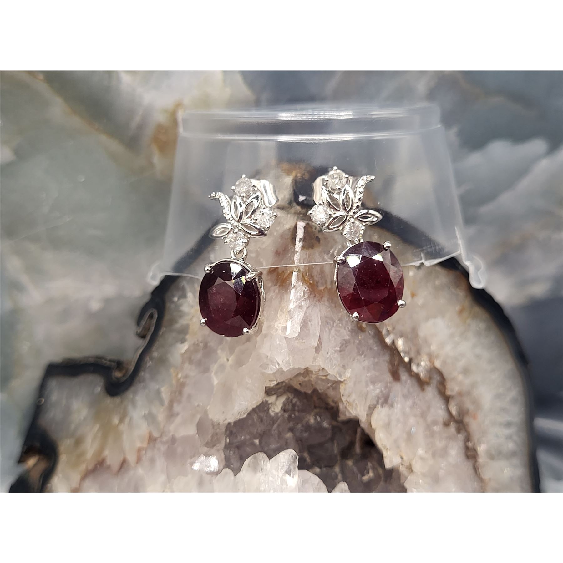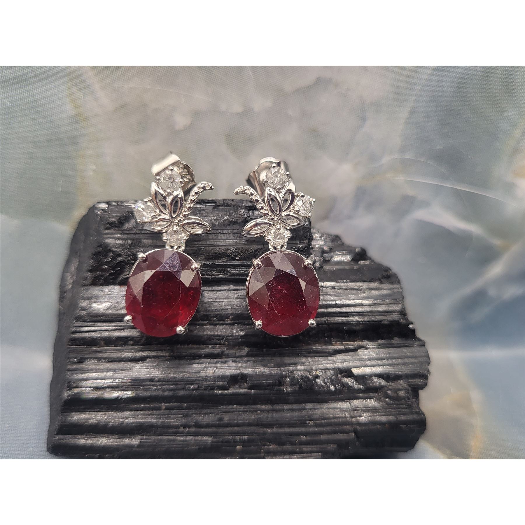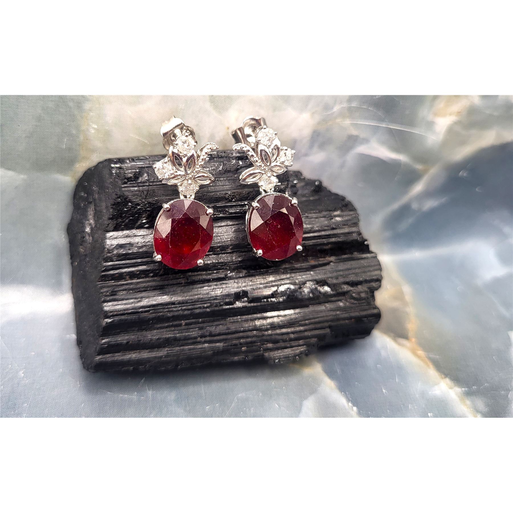 These sterling silver dangling earrings are so fancy, yet frivolous with a surprisingly low reserve (undisclosed at consignor's discretion).& nbsp; Each earring is prong-set with an approximate 6.50 carat oval-cut ruby corundum* and is topped with fancy swirls of sterling silver with three round, brilliant-cut, H-I color, I1-I2 clarity, .10 carat diamonds, for a total of 13.49 carats total weight ruby corundum* and .64 carats total weight diamonds.& nbsp; The earrings hang approximately 1 1/8& quot; and attach to the earlobe with posts and friction backs.& nbsp; Admin: ER000200/lag