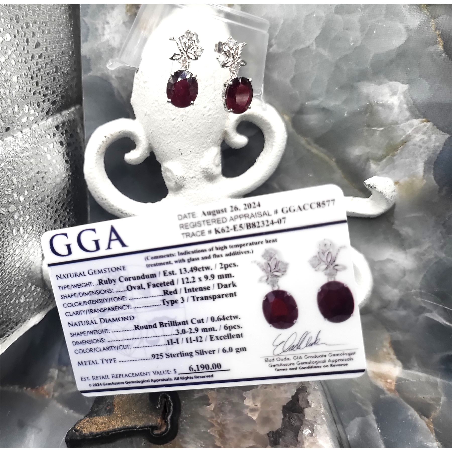 *The appraisal indicates these rubies have been enhanced by applying high heat and glass flux (see appraisal).& nbsp; Almost all rubies used in jewelry are treated in some manner, usually involving heat.& nbsp; When high heat and any type of flux is added, the ruby corundum normally becomes clearer and brighter and the price is much less than a ruby with no to little treatment, making beautiful fine jewelry so affordable. However, special care is required.& nbsp; Some rules of care are to never immerse ruby corundum into harsh chemicals (regardless of temperature), like a chlorine swimming pool or hot tub or mechanical jewelry cleaning machine.& nbsp; Clean with a soft, dry cloth and cool water, using little to no mild soap.& nbsp; Other tips can be found online.