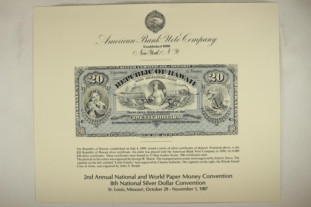 CONVENTION 1987 WITH A BANKNOTE INTAGLIO OF 1895 REPUBLIC OF HAWAII $20 SILVER CERTIFICATE OF DEPOSIT PRINTED BY THE AMERICAN BANK NOTE COMPANY