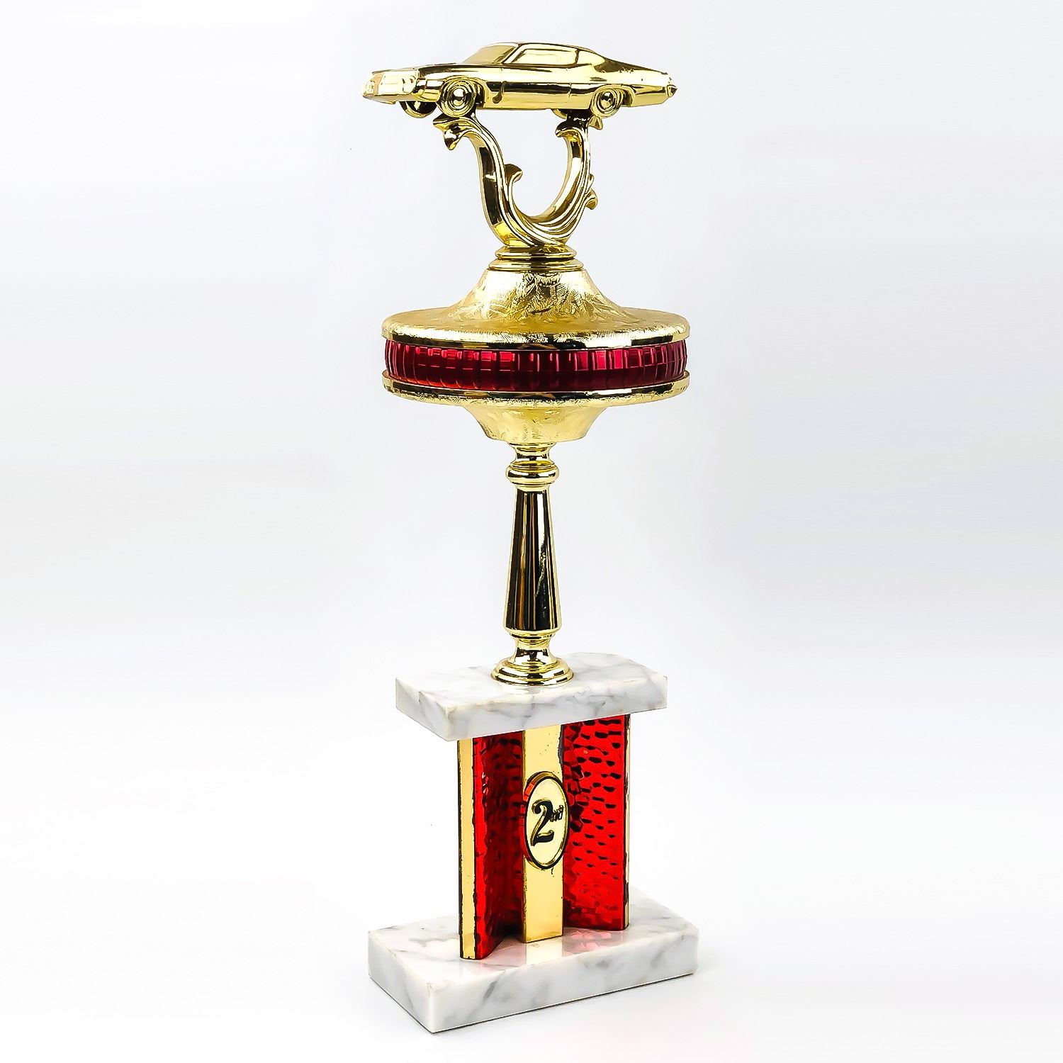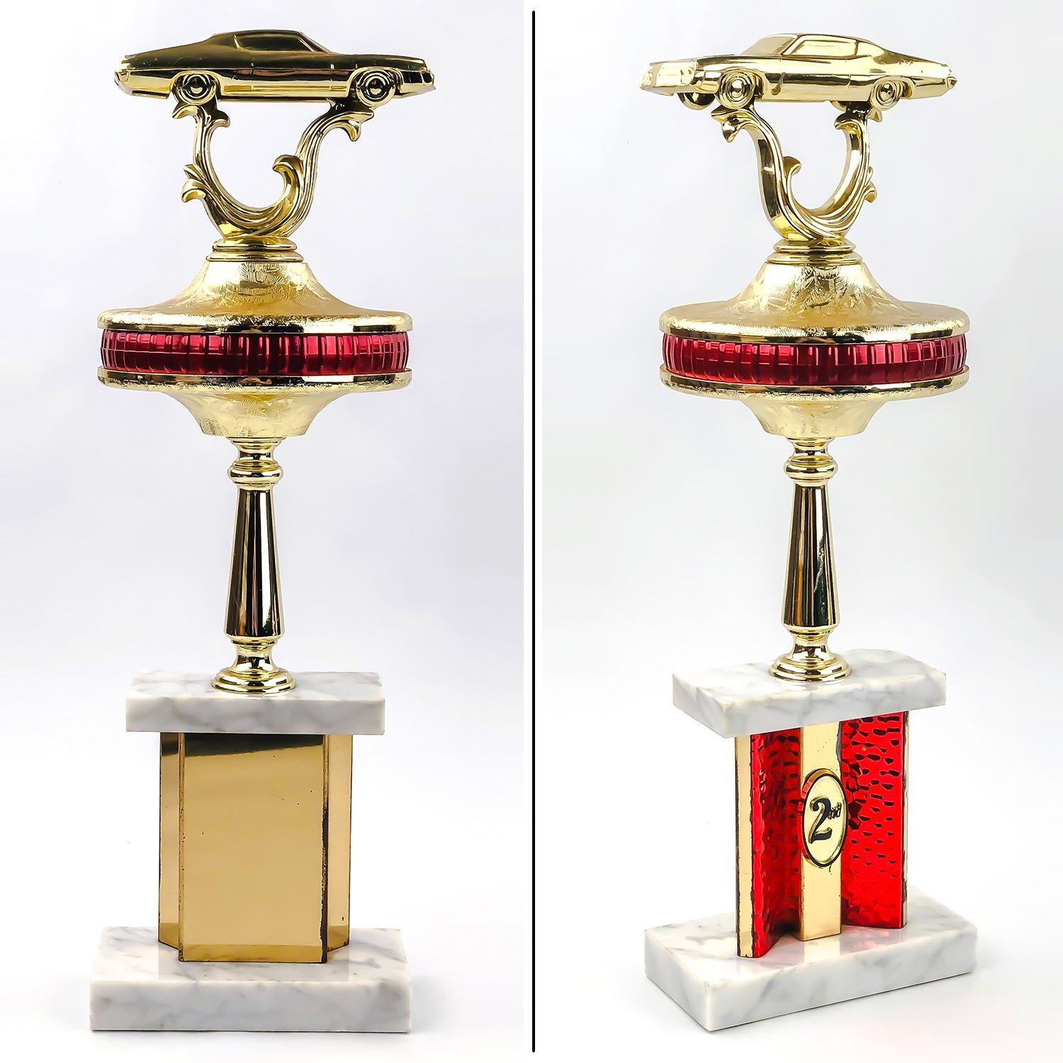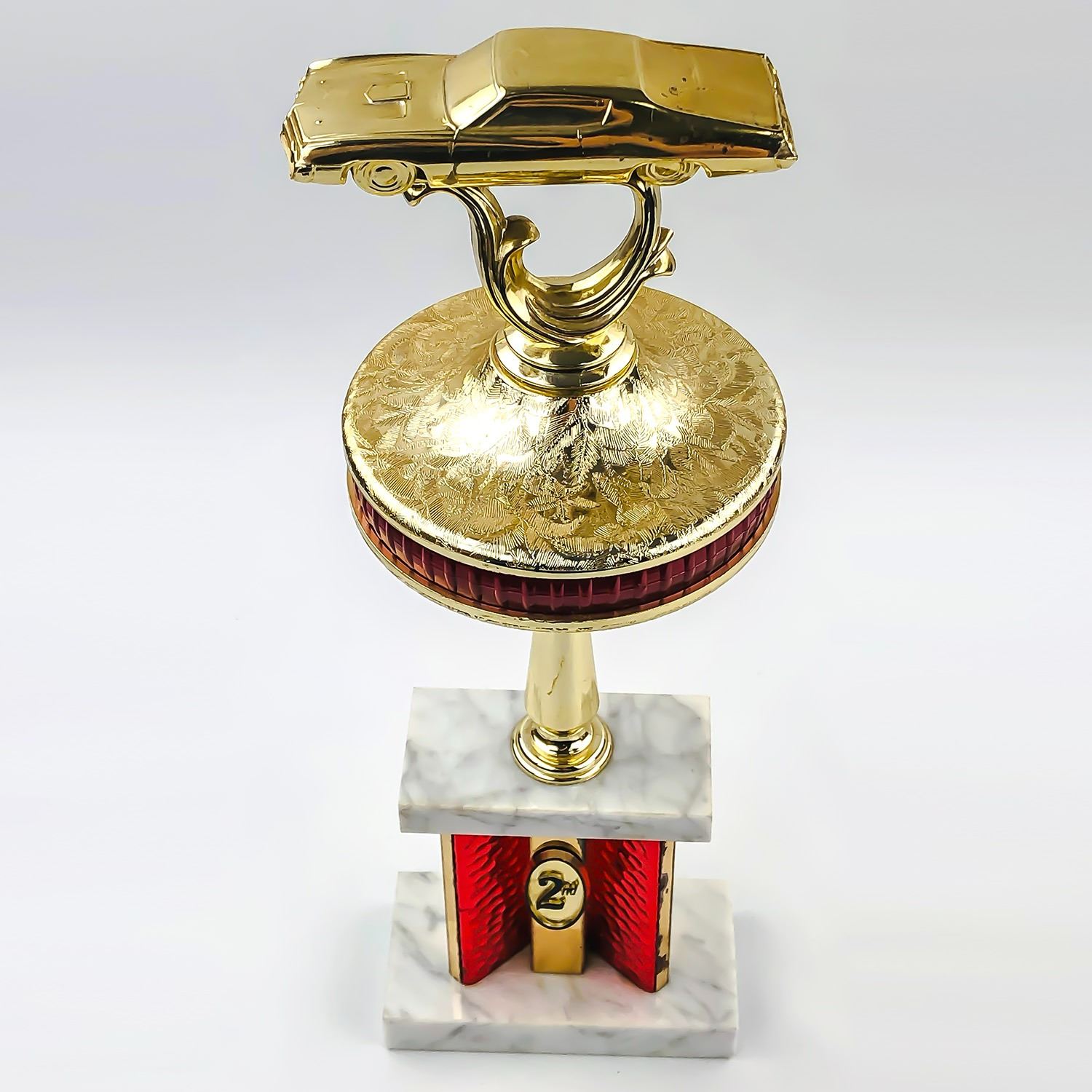 #8810 - VINTAGE CAR SHOW NOSTALGIA - 2ND PLACE CAR TROPHY - MARBLE BASE FROM ITALY. MEASURES: 15.75” (40 CM) TALL BY 5” (13 CM) WIDE BASE. BASE DEPTH IS 2.5” (6.5 CM) AND THE CENTER PORTION DIAMETER IS 5” (13 CM) DIAMETER. CAR IS 5” (13 CM) LONG