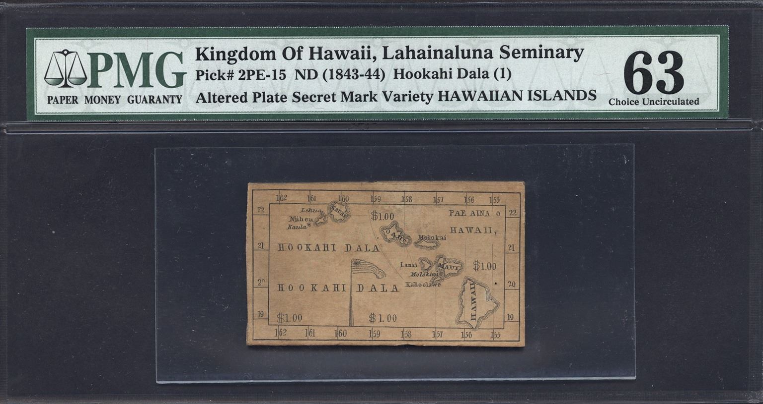 2PE-15 ND (1843-44) HOOKAHI DAL ($1.00) Kingdom of Hawaii, Lahainaluna Seminary Altered Plate Secret