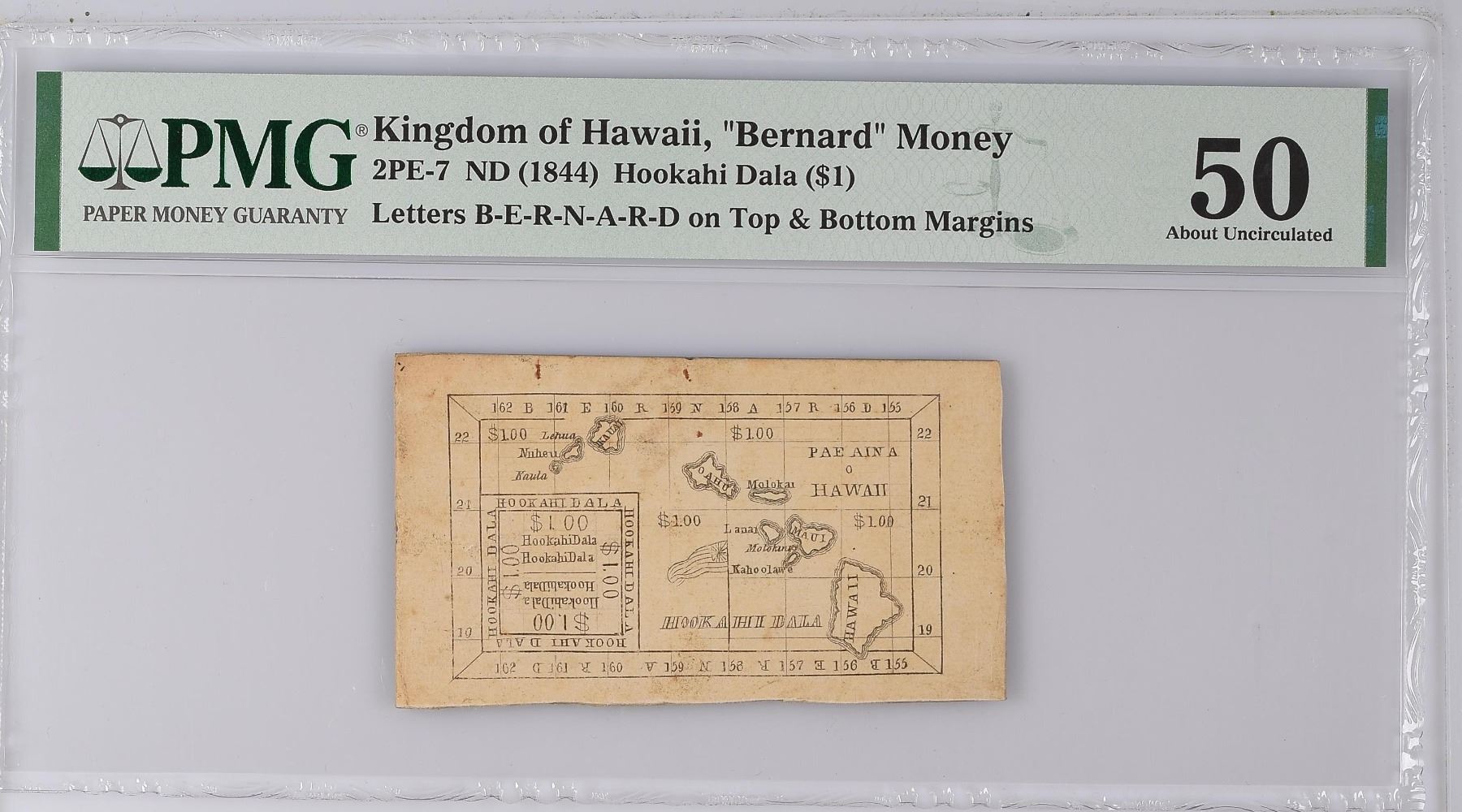 Title: 2PE-7 (1844) HOOKAHI DOLLAR ($1.00) KINGDOM OF HAWAII, “Bernard” Money. PMG-50.