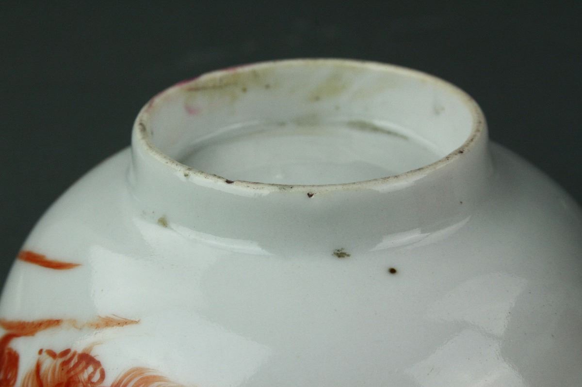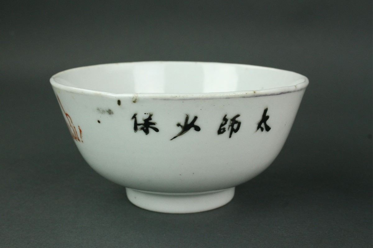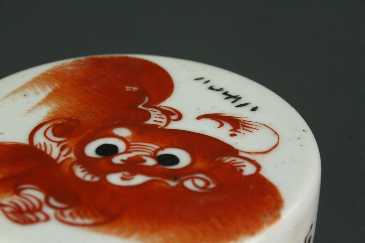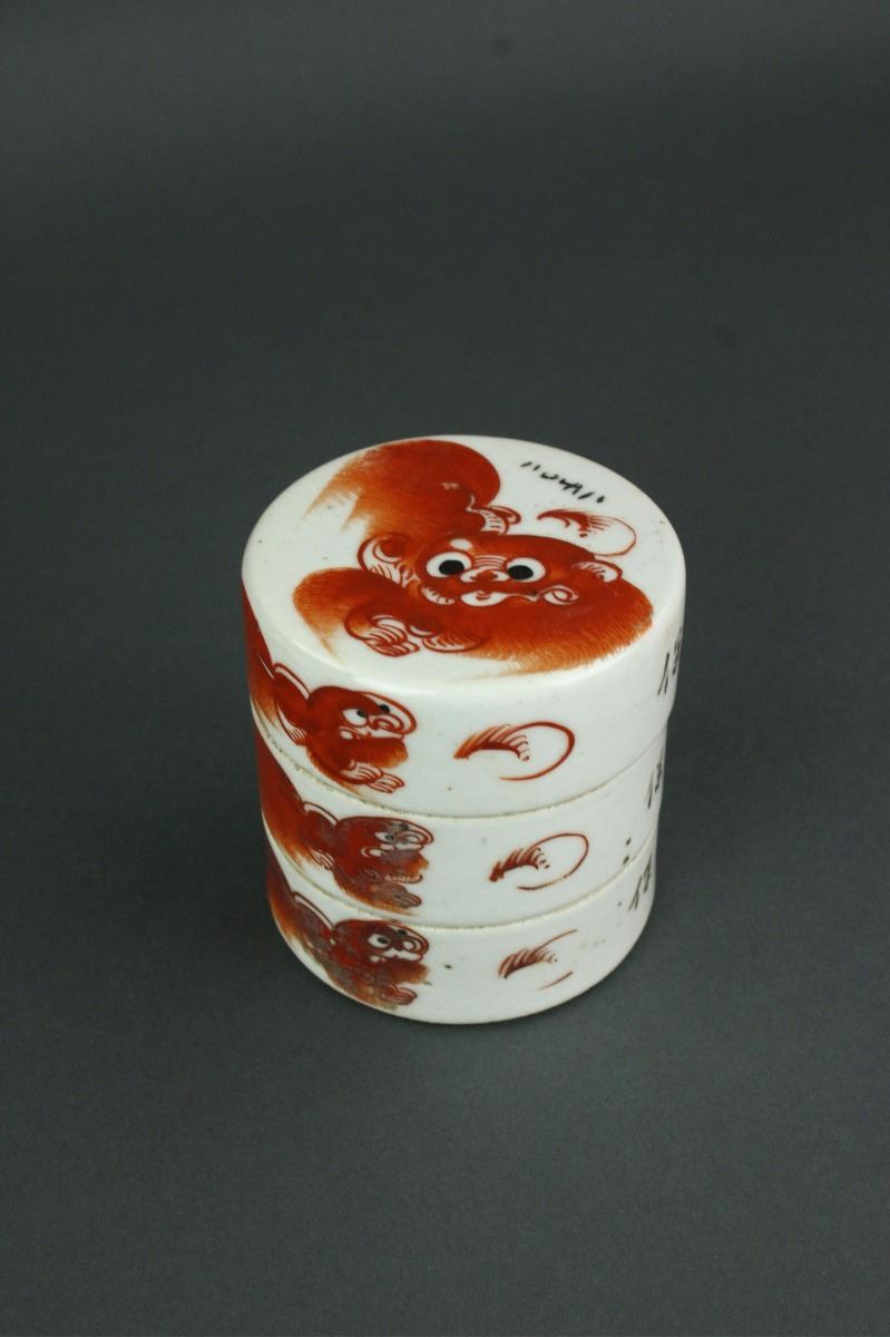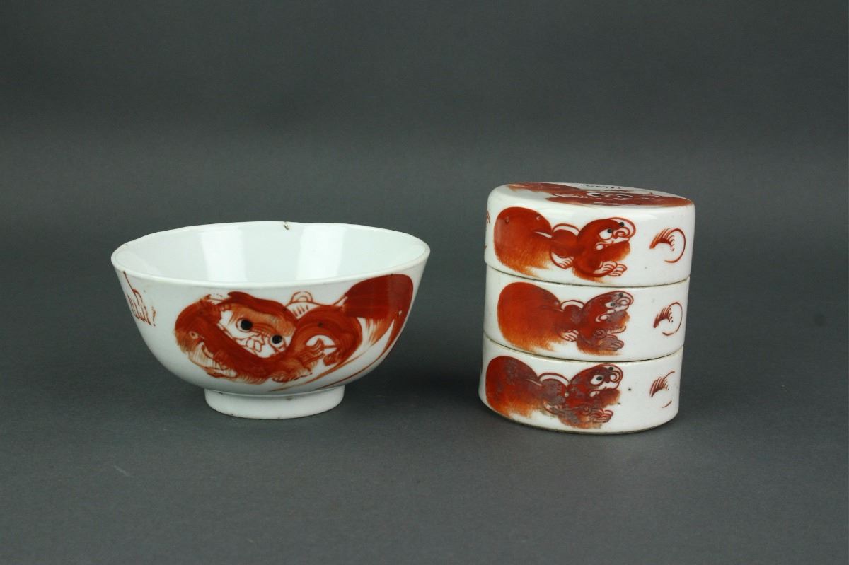 Two pieces of Chinese copper red porcelain bowl and three-layered box; decorated with Fu dogs and calligraphy; Box H: 8 cm, Bowl H: 6 cm, Box D: 7.5 cm, Bowl D: 11.5 cm, 395 grams total
