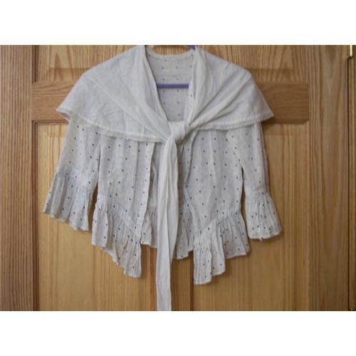 Polka dot cotton material.Hook and eye closure in front.Has a cape effect connected that ties in front.Top measures 14" across shoulders-13" across front by waist-15 1/2" sleeve length with ruffle(this is a 3/4 length sleeve)21" long from back of neck to end of ruffle in front.Skirt is 12" across front with adjustable hook and eye inside.,by 35 1/2" long in front and 38 1/2" long in back.No holes or tears.