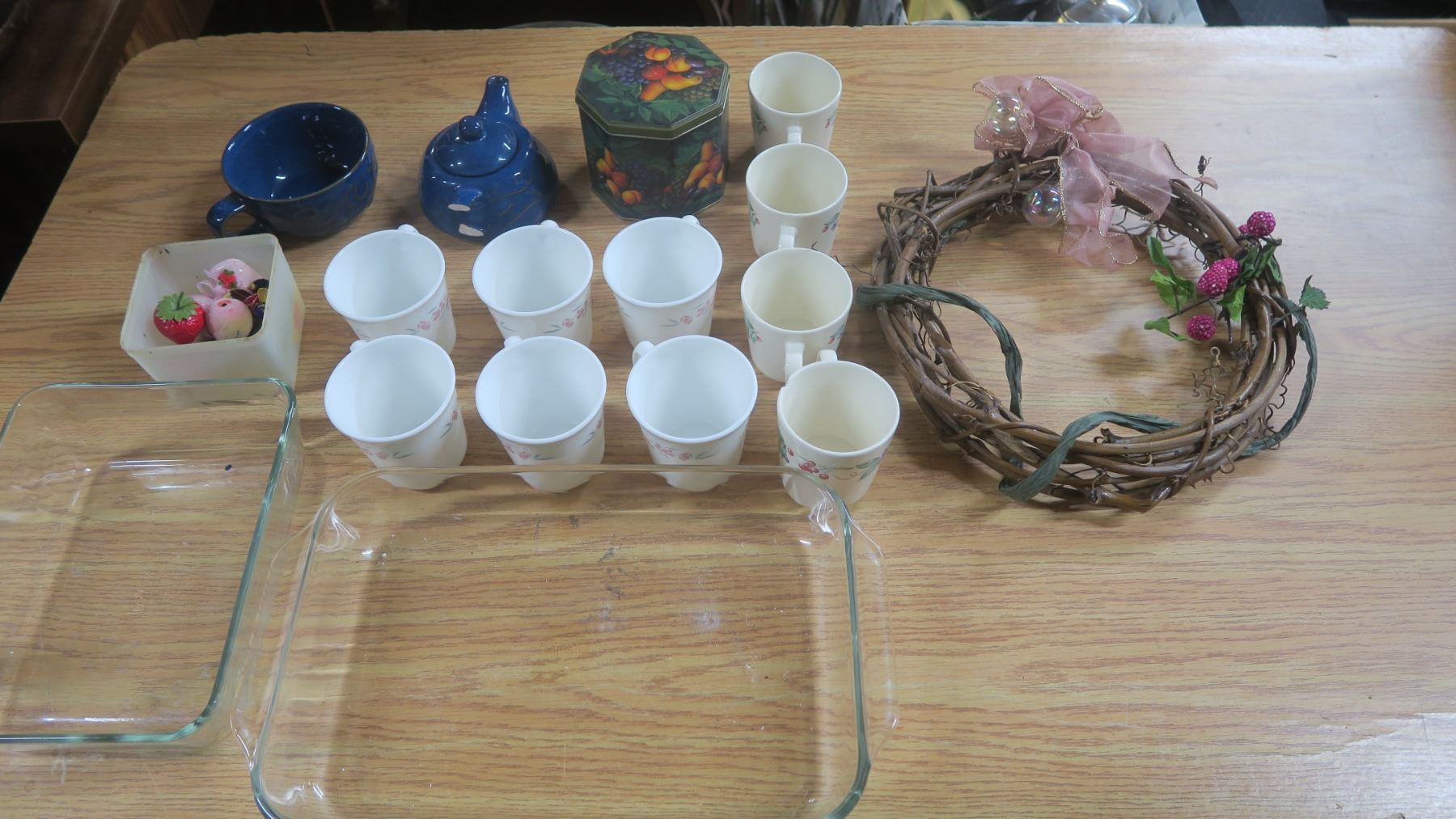 2X Pyrex Bowls, 10X Tea/Coffee Cups, Kettle W/ Matching Bowl, Decorative Tin, Box of Christmas Ornaments