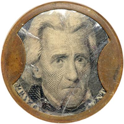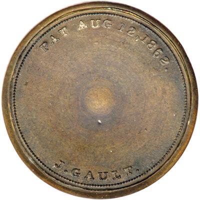 2¢ Encased Postage. Gault, J. . Fr-EP-31. This J. Gault 2¢ "Black Jack" is a legendary rarity in the encased postage series. One of only three known to exist! This is the famous Arnold Pearle specimen as shown in the Hewitt Numismatic Information Booklette, by Arlie R. Slabaugh. The case is fully Very Fine or better and is exceptionally original and a lovely chestnut brown in color. A tiny nick is located on the right obverse tab and is mentioned for identification. The mica has a natural flaw line and a few minor crazed areas. The stamp is a rich black color clearly exhibiting all details. One of the most fantastic rarities offered in this area of numismatics and is destined for the ultimate collection.