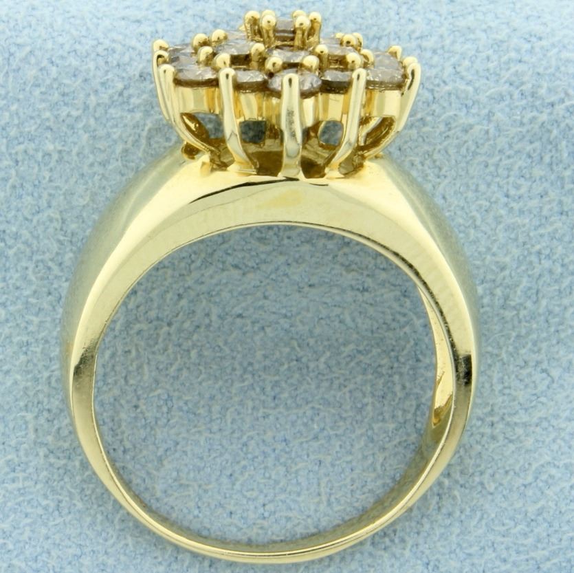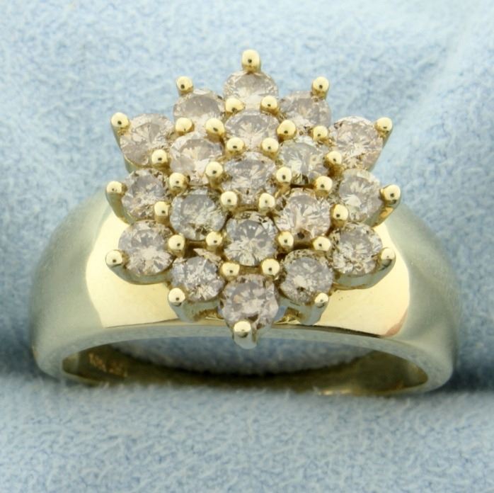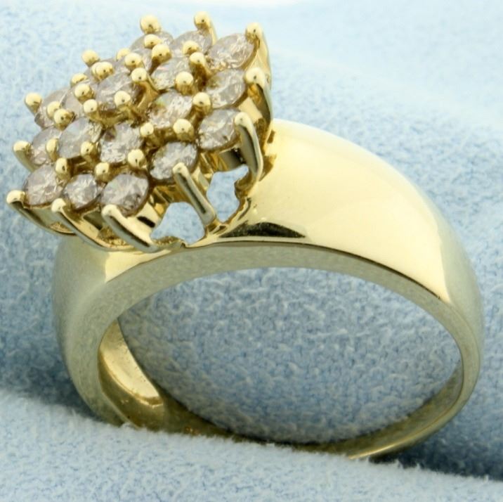 In 10K yellow gold, there are nineteen round champagne diamonds with a warm color and great clarity. Size 9 3/4 6.3g