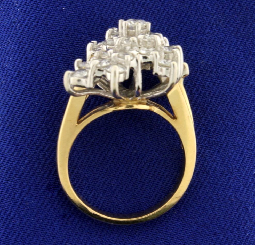 In 14k yellow gold. Center diamond is a high quality .25ct diamond surrounded by twenty four .075ct diamonds. All diamonds are SI1clarity/F color, completely eye clean, and very white with excellent cut for lots of sparkle. Size 6. 8.0g.