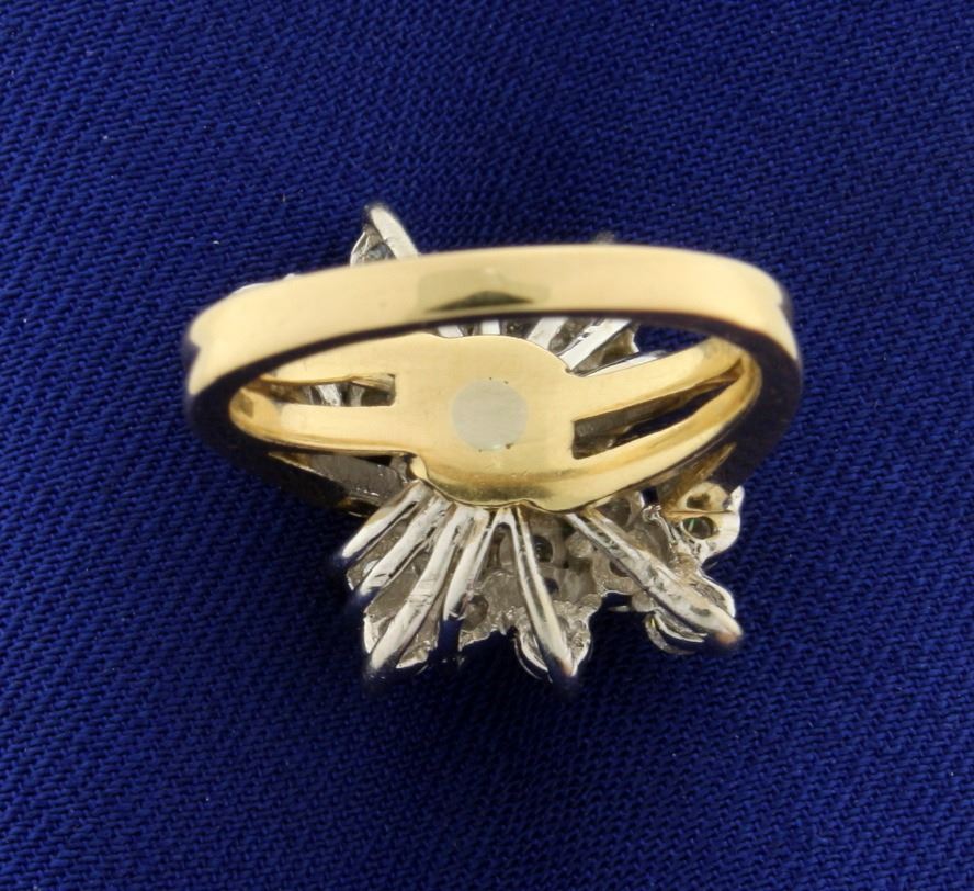 In 14k yellow gold. Center diamond is a high quality .25ct diamond surrounded by twenty four .075ct diamonds. All diamonds are SI1clarity/F color, completely eye clean, and very white with excellent cut for lots of sparkle. Size 6. 8.0g.