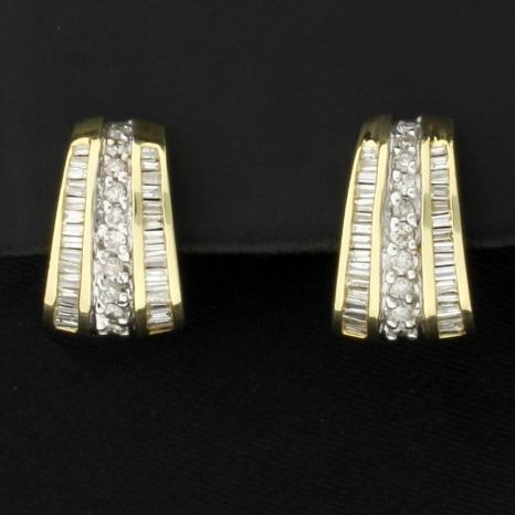 In 14K yellow & white gold, they are 5/8 inch long and have safety backs. Earrings contain .4 ct of round diamonds and 1.6 cts total weight of baguettes around it. Diamonds are SI clarity/I color. 7.2g