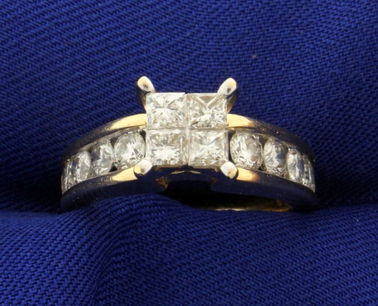 In 14k yellow gold, containing four high quality invisibly set princess cut diamonds that look like 1ct solitaire diamond. Diamonds are of VS clarity/H color. Also contains ten round brilliant diamonds in shank of similar high quality. Size 6 3/4. 7.0g.