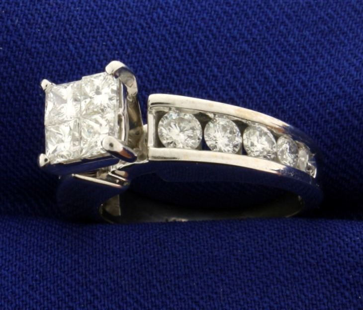 In 14k white gold, containing four 1/4ct each invisible set princess diamonds. Set to look like one giant 1.5ct diamond. Diamonds are very high quality VS clarity/G color. Also contains two .14ct, two .12ct, two .08ct, and two .06ct diamonds in shank SI clarity/G color. Size 5.5. 6.5g