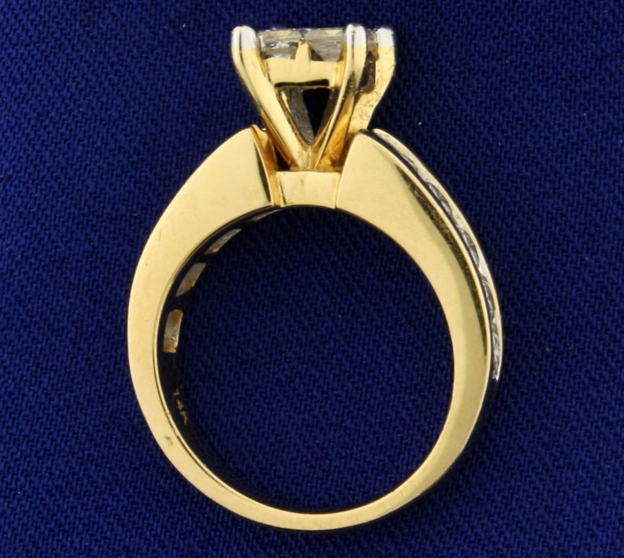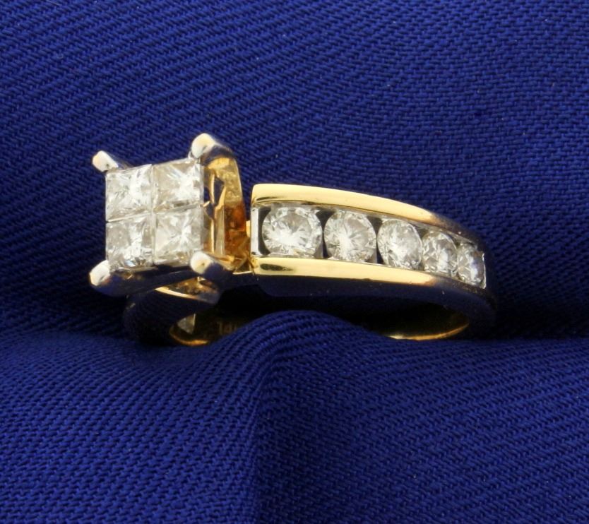 In 14k yellow gold, containing four high quality invisibly set princess cut diamonds that look like 1ct solitaire diamond. Diamonds are of VS clarity/H color. Also contains ten round brilliant diamonds in shank of similar high quality. Size 6 3/4. 7.0g.