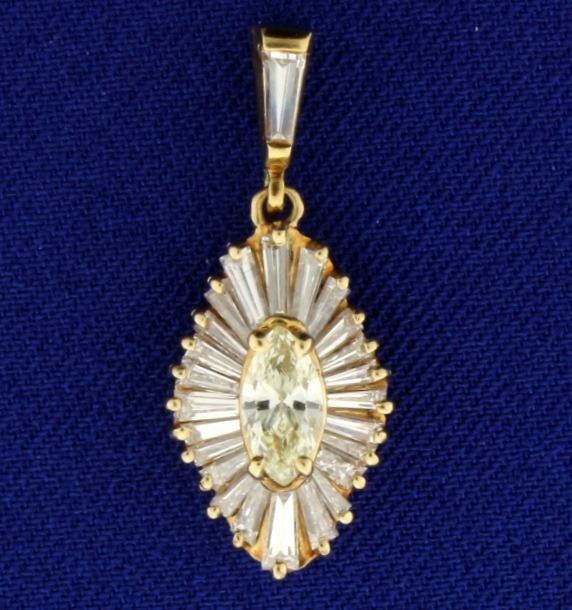 In 14k yellow gold, 1 inch long. Center diamond is .4 ct Marquise, with a clarity of SI and a color of M, surrounded by 1.6 ct of Baguette diamonds, with a clarity of SI and a color of G. 2.3g