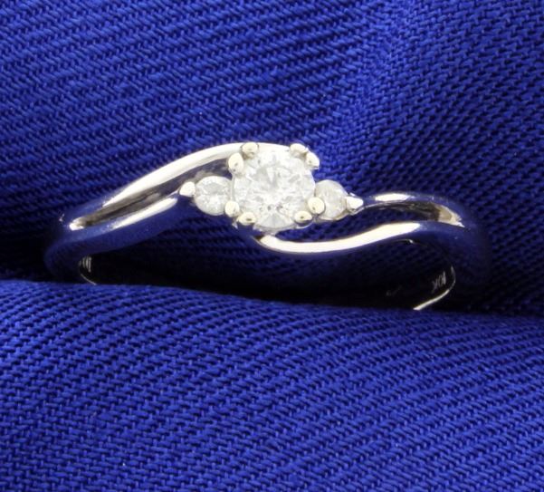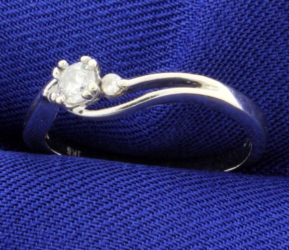 In 10K white gold, the ring contains one .16ct round diamonds and two .02ct round diamonds, nice H color. Size 6 3/4 1.9g