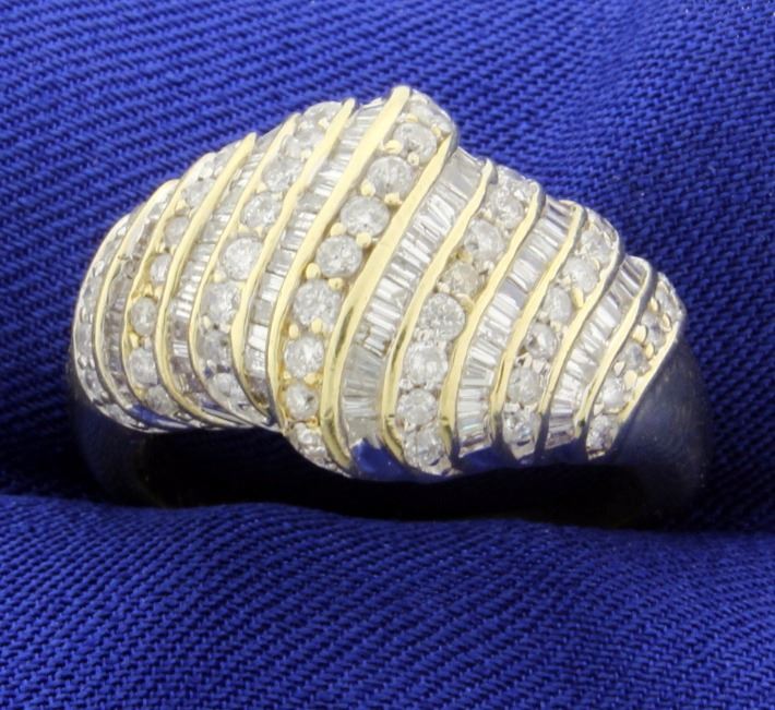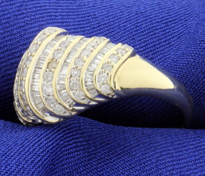 In 14K yellow gold, this ring contains 2ct TW of high quality round and baguette diamonds that are SI clarity/G color. Size 9 1/2 8.0g