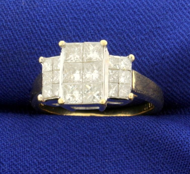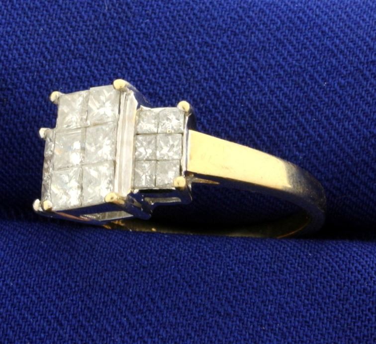 In 14k yellow and white gold. Contains six high quality .2ct and twelve .07ct princess cut diamonds. SI clarity/G color. Diamonds are invisible set to look like 3 huge diamonds. Size 8 1/2. 5.1g.