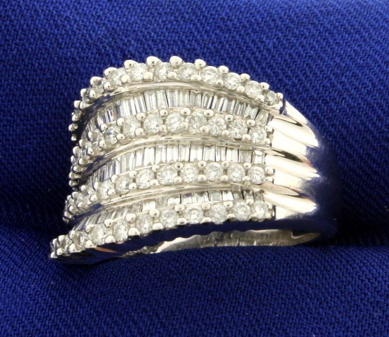 In 14k white gold. Contains 2ct TW of high quality round and baguette diamonds of SI1 clarity/F color. Diamonds are eye clean that are very white and great cut for lots of sparkle. Size 7 1/4. 10.0g.