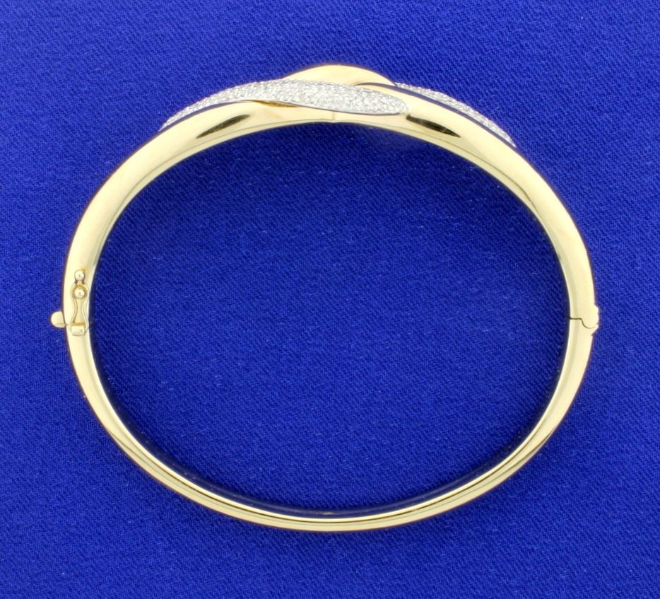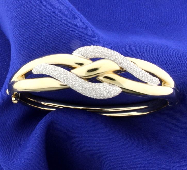 In 14K yellow gold, the bangle is 2 3/4 inches in diameter and has a safety clasp. This bracelet contains 2cts total weight of diamonds. 19.7g