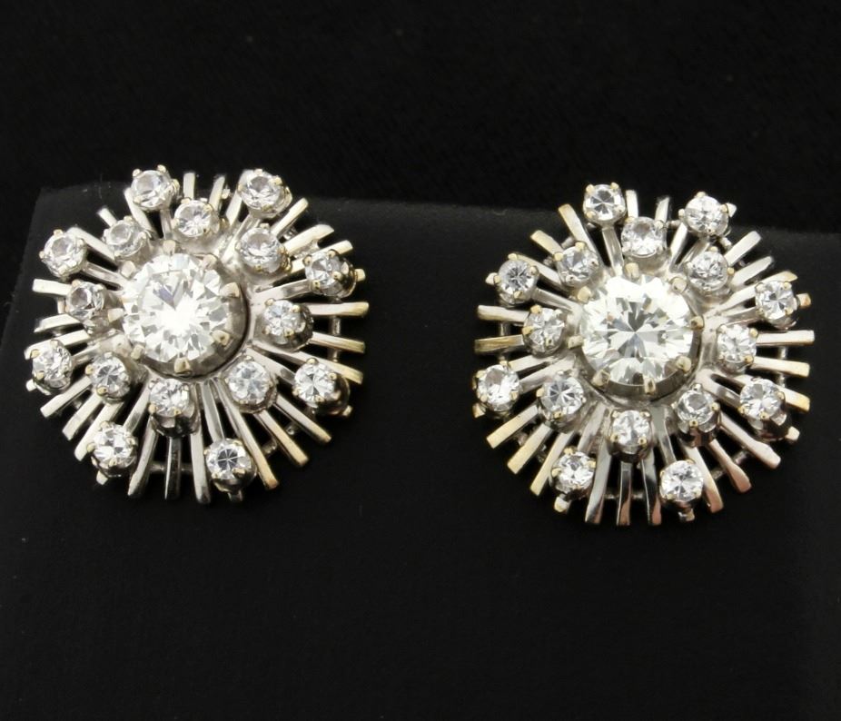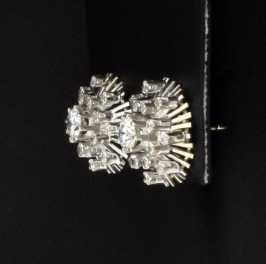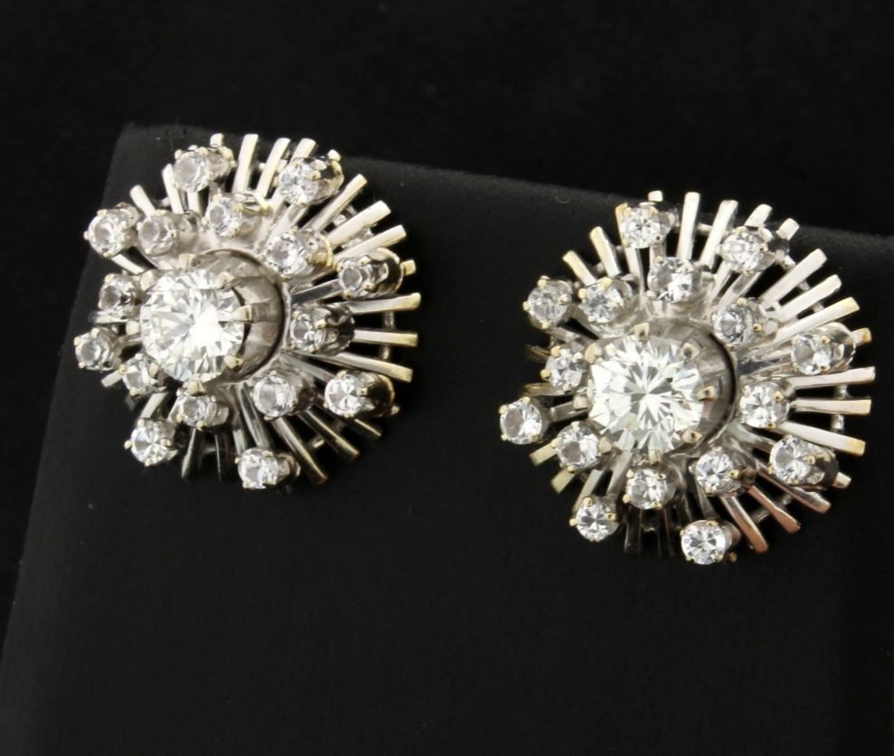 In 14K white gold, each earring has a 1/2ct diamond surrounded by sixteen .03ct diamonds-all ultra high quality VVS clarity, F color. They have friction backs. 7.4g