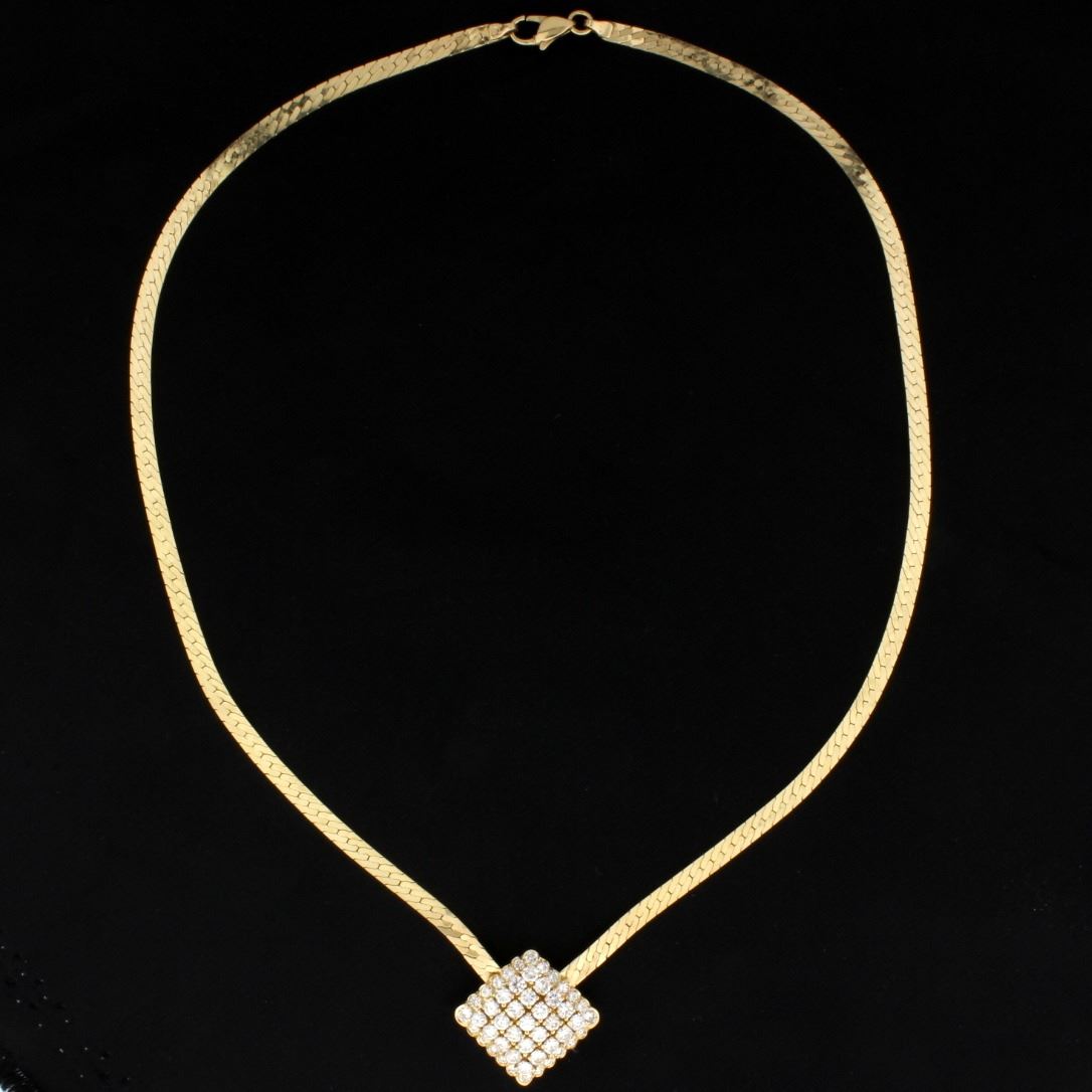 In 14K yellow gold, this necklace contains Twenty Nine .05ct diamonds and Twenty .03ct diamonds, all are exceptionally high quality with VS clarity, F color. It is 17 inches long. 11.4g