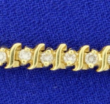 This bracelet is 14K yellow gold and contains 2ct total weight of high quality SI clarity/H color diamonds. It is 7 1/4 inches long. 13.3g