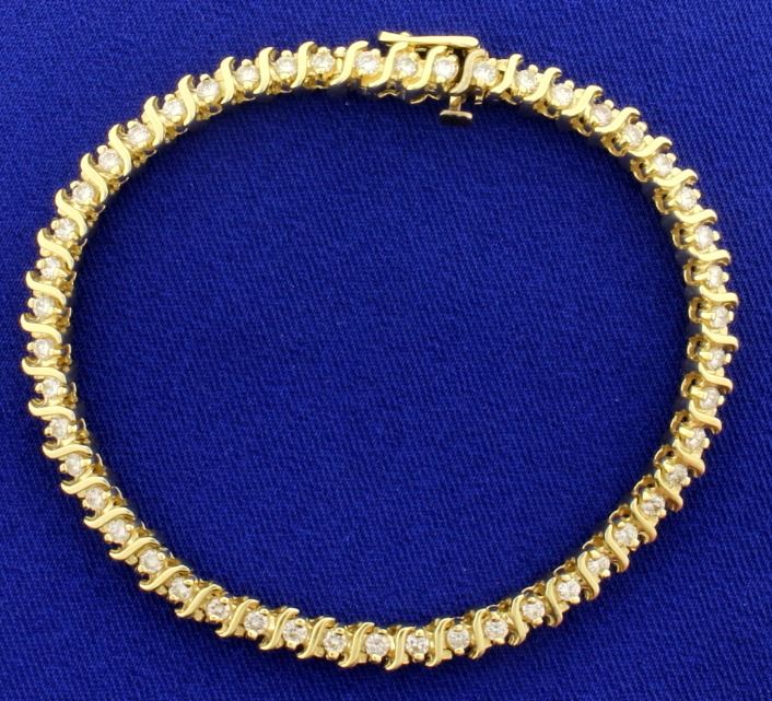 This bracelet is 14K yellow gold and contains 2ct total weight of high quality SI clarity/H color diamonds. It is 7 1/4 inches long. 13.3g