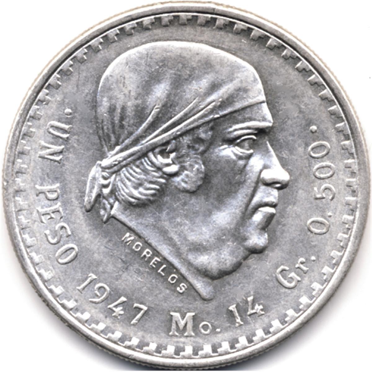 2ea. 1947 MEXICO MORALES SILVER ONE PESO-CH BU+
