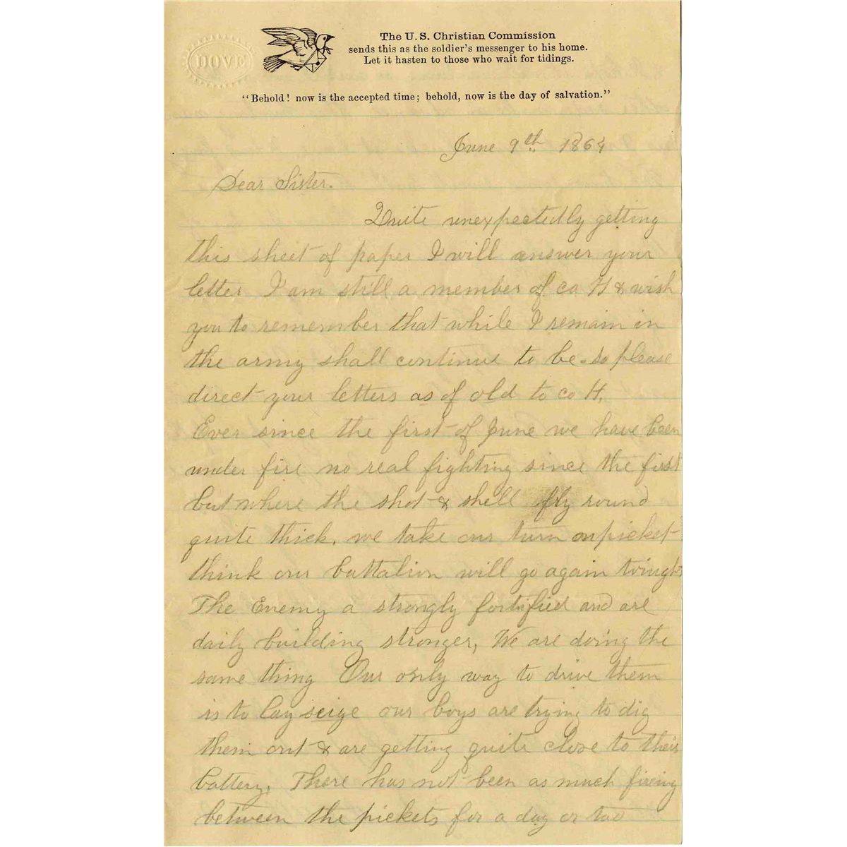 Four page Civil War soldier's letter by Corp. Homer S. Sackett of the 2nd Connecticut Heavy Artillery, Co. H, on Christian Commission stationery dated 9 June 1864 at Cold Harbor. Letter reads in part, ''…I am still a member of Co. H…Ever since the first of June we have been under fire. No real fighting since the first, but where the shot & shell fly round quite thick. We take our turn on picket. Think our battalion will go again tonight. The enemy a strongly fortified and are daily building stronger. We are doing the same thing. Our only way to drive them is to lay siege. Our boys are trying to dig them out & are getting quite close to their battery. There has not been as much firing between the pickets for a day or two & I hope it will continue. So untill one or the other side make an advance. This hunting men, as I used to woodchucks at home, I don't fancy. We have some sweets with the bitter. There are two or three bands in the corps. Two of them are playing now. Yes sir, I hope we may meet again & enjoy the quiet life of Old Warren, but it is very uncertain. Still, will hope for the best. You must not get to impatient. It is no small job to get to Richmond & many a poor fellow will fall by the way. I suppose we are about 8 miles from there; Some say 7…'' Shortly before this letter was written the 2nd Connecticut Heavy Artillery lost over three hundred casualties at Cold Harbor. Sacket survived and was discharged a Sergeant in July 1865. Very good condition.