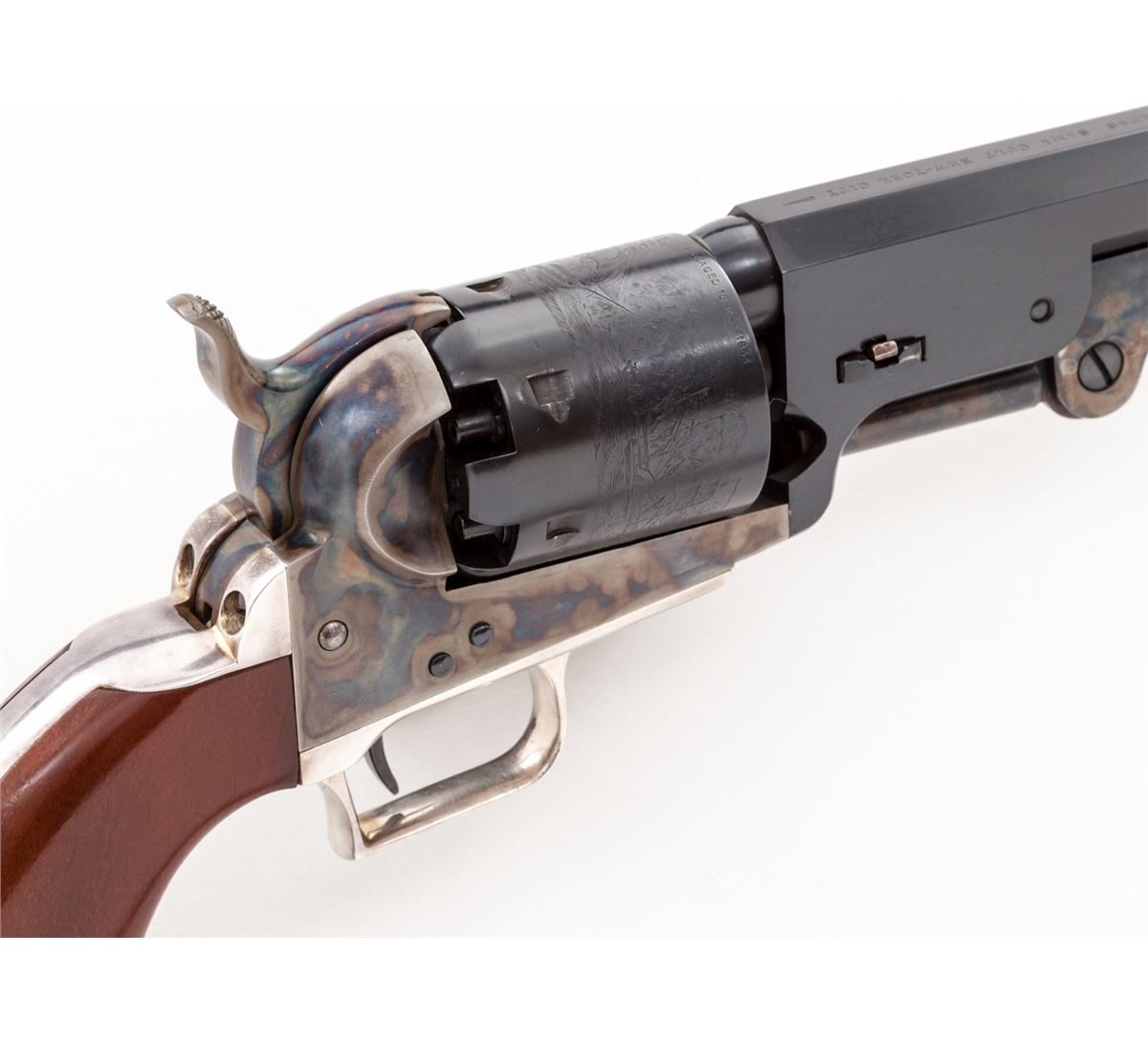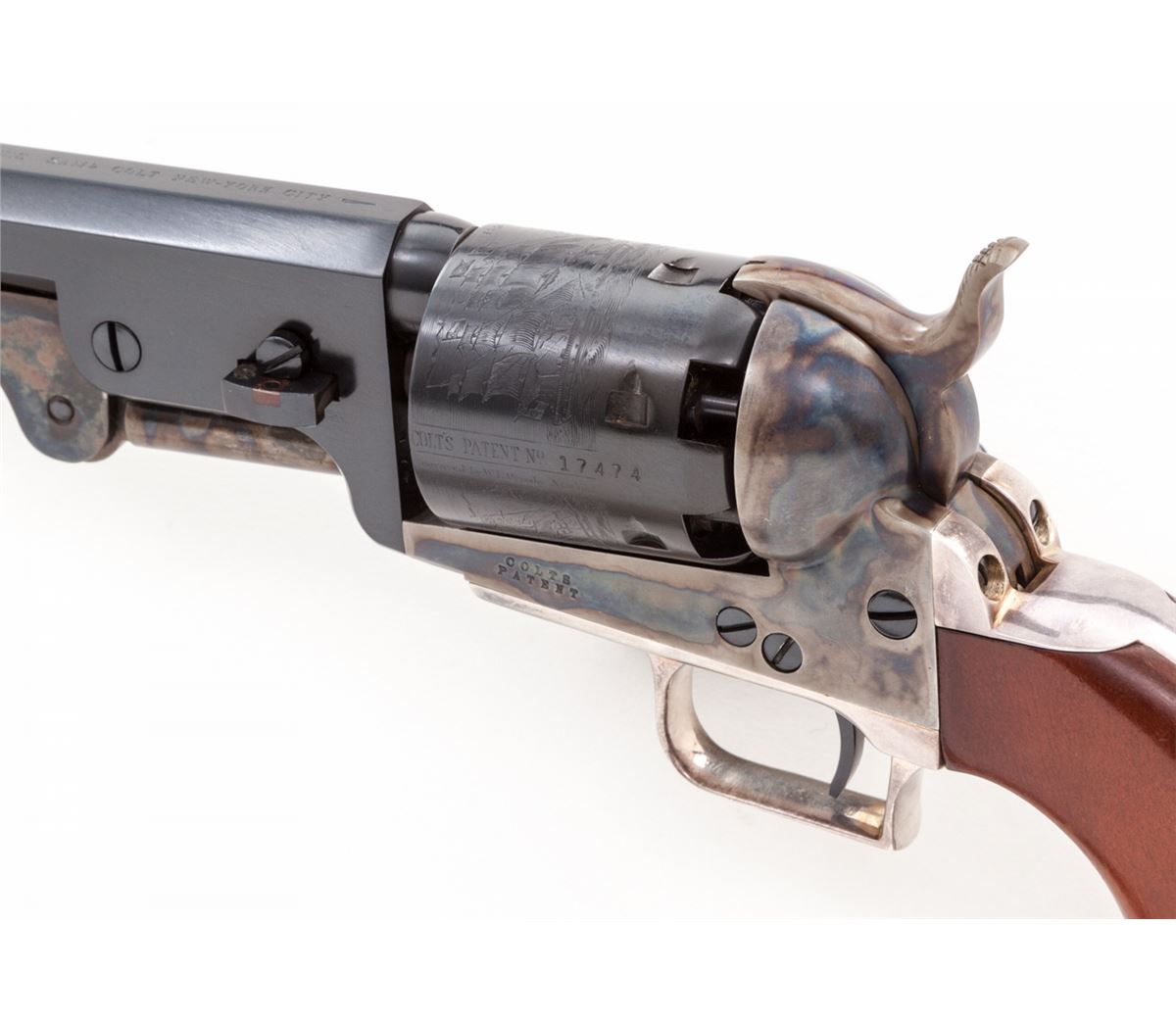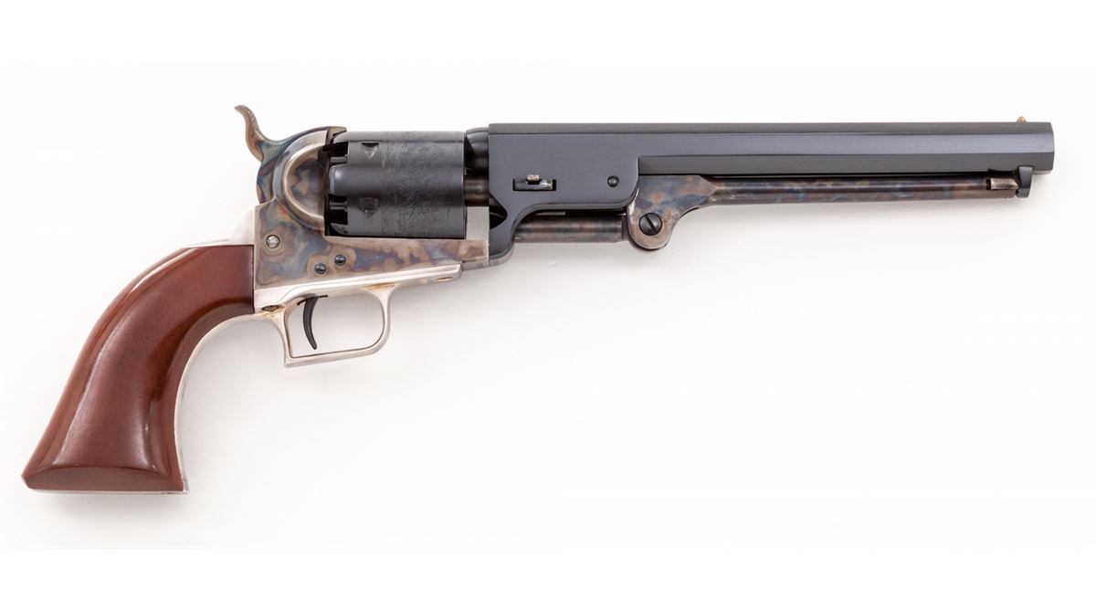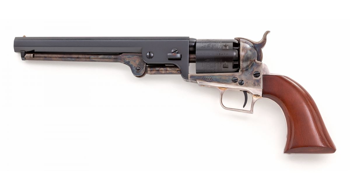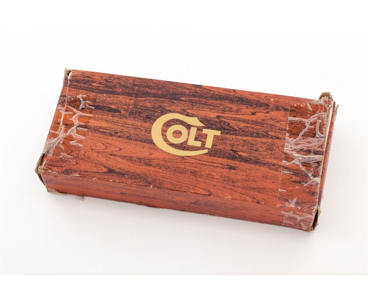 2nd Gen. Colt 1851 Navy Percussion Revolver, #17474, .36 ball, 7-1/2'' barrel, blue and case hardened finish, silver-plated backstrap and triggerguard, and one-piece dark stained grips, in original box. Condition is excellent, appearing as new, showing only light handling marks to grips. Colt box shows tape repairs and missing end labels. Est.: $500-$750. (Antique)